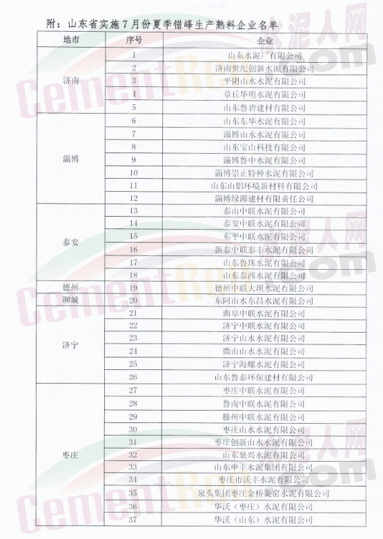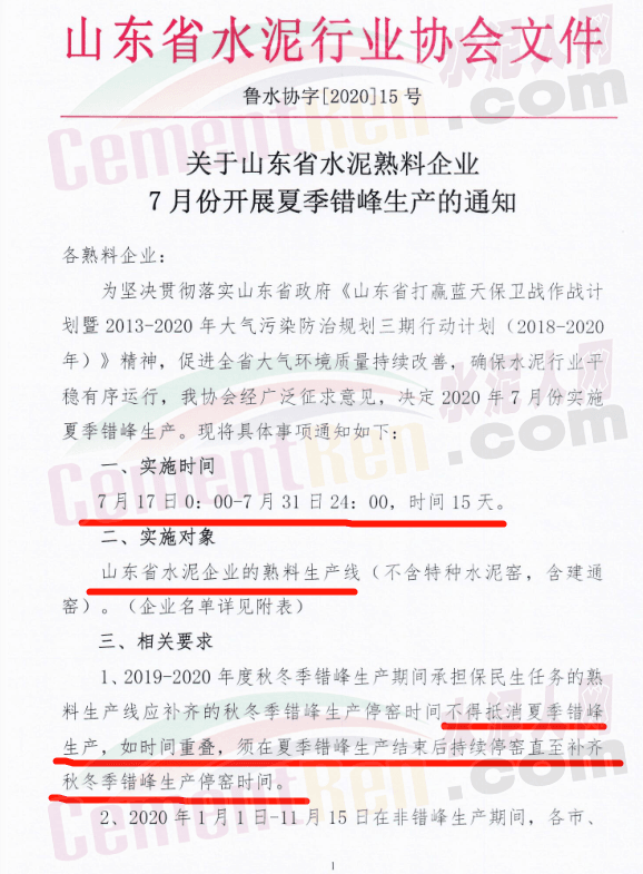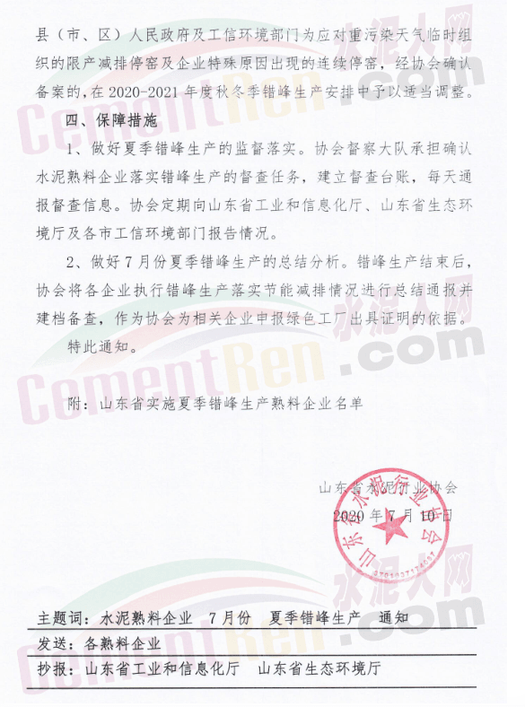 據水泥人網消息,近日,山東省水泥行業協會發布《關于山東省水泥熟料企業7月份開展夏季錯峰生產的通知》稱:為堅決貫徹落實山東省政府《山東省打瀛藍天保衛戰作戰計劃暨2013-2020年大氣污染防治規劃三期行動計劃(201-2020年)》精神,促進全省大氣環境質量持續改善,確保水泥行業平穩有序運行,山東省水泥協會決定2020年7月份實施夏季錯峰生產,具體通知如下: