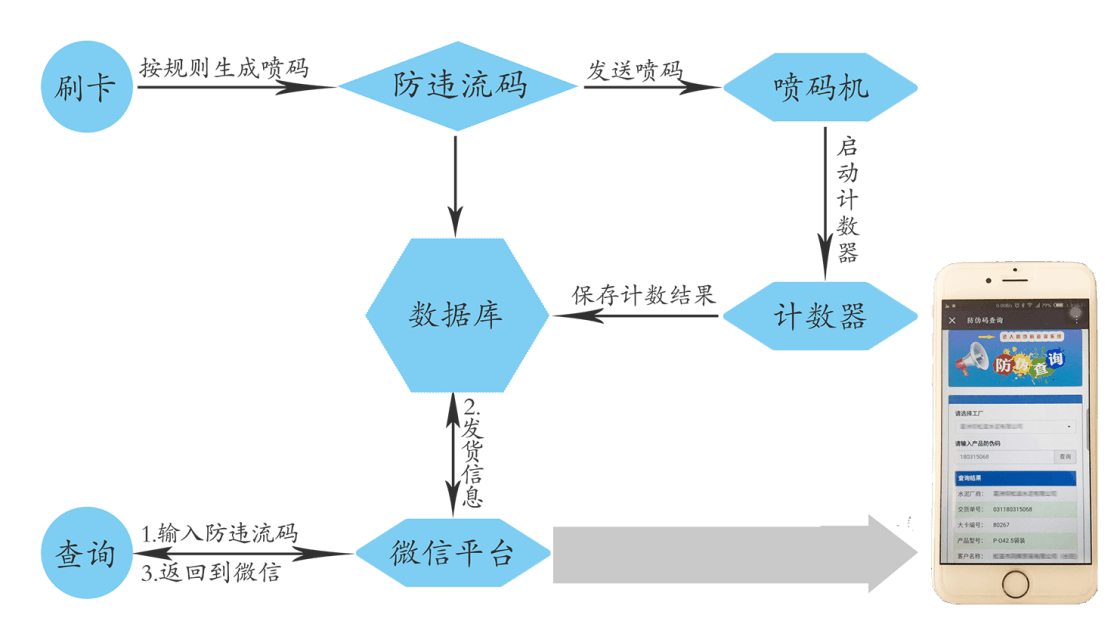 提貨車輛到達(dá)袋裝水泥裝車現(xiàn)場(chǎng),根據(jù)排隊(duì)信息,進(jìn)入相應(yīng)的裝車道排隊(duì);車輛到達(dá)裝車位后,在對(duì)應(yīng)刷卡器刷卡,系統(tǒng)自動(dòng)校驗(yàn)信息,校驗(yàn)成功后,將提貨信息發(fā)送給控制設(shè)備,同時(shí),將噴碼信息發(fā)送給噴碼機(jī),然后啟動(dòng)計(jì)數(shù)器,實(shí)現(xiàn)袋裝水泥自動(dòng)噴碼計(jì)數(shù)。