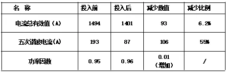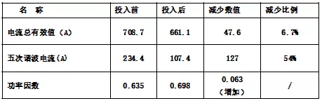由表2可知,投入諧波動態治理裝置后可使低壓母線電流有效值降低6.2%,低壓母線5次諧波電流值下降55%;提高電能質量,提高功率因數,減少電力安全事故;使企業的節省電能6%以上。