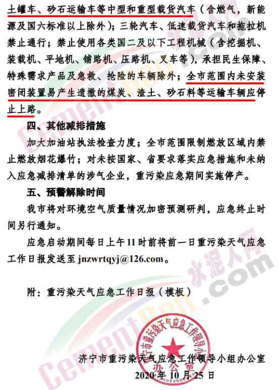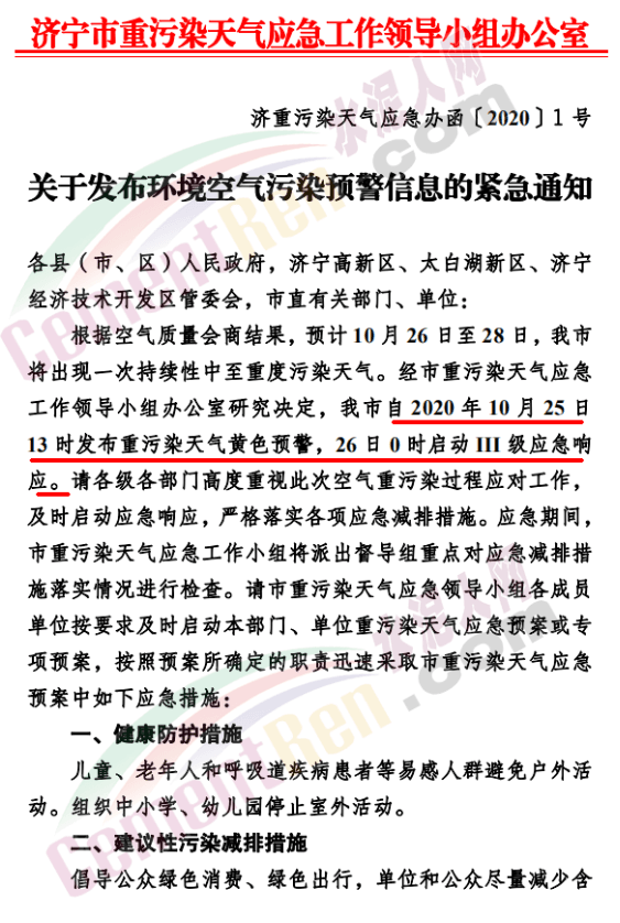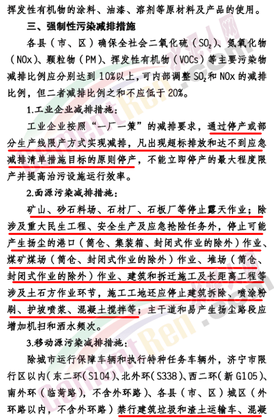 要求工業(yè)企業(yè)按照“一廠一策”的減排要求,通過停產(chǎn)或部分生產(chǎn)線限產(chǎn)方式實(shí)現(xiàn)減排,凡出現(xiàn)超標(biāo)排放和達(dá)不到應(yīng)急減排清單措施目標(biāo)的原則停產(chǎn),不能立即停產(chǎn)的最大程度限產(chǎn)并提高治污設(shè)施運(yùn)行效率。礦山、砂石料場、石材廠、石板廠等停止露天作業(yè);除涉及重大民生工程、安全生產(chǎn)及應(yīng)急搶險任務(wù)外,停止可能產(chǎn)生揚(yáng)塵的港口作業(yè)、煤礦煤場作業(yè)、堆場作業(yè)、建筑和拆遷施工及長距離工程等涉及土石方作業(yè)環(huán)節(jié),施工工地還應(yīng)停止建筑拆除、噴涂粉刷、護(hù)坡噴漿、混凝土攪拌等。除城市運(yùn)行保障車輛和執(zhí)行特種任務(wù)車輛外,濟(jì)寧市限行區(qū)以內(nèi)禁行建筑垃圾和渣土運(yùn)輸車、混凝土罐車、砂石運(yùn)輸車等中型和重型載貨汽車。全市范圍內(nèi)未安裝密閉裝置易產(chǎn)生遺撒的煤炭、渣土、砂石料等運(yùn)輸車輛應(yīng)停止上路。對未按國家、省要求落實(shí)應(yīng)急措施和未納入應(yīng)急減排清單的涉氣企業(yè),重污染應(yīng)急期間實(shí)施停產(chǎn)。通知原文如下: