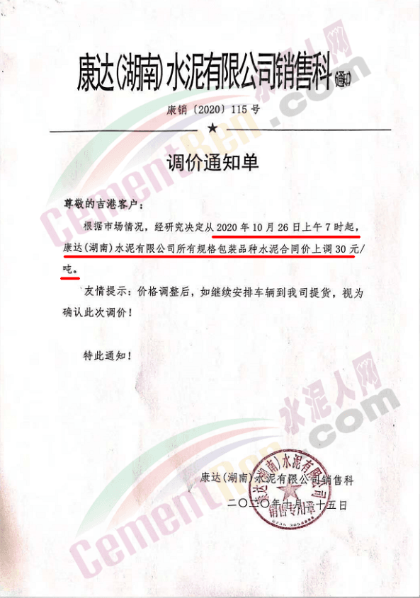 紅獅水泥旗下康達(dá)(湖南)水泥有限公司銷售科通知,自今日(10月26日)上午7時起,所有規(guī)格包裝品種水泥合同價上調(diào)30元/噸。