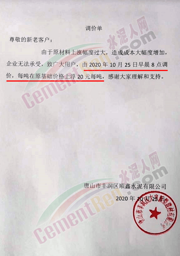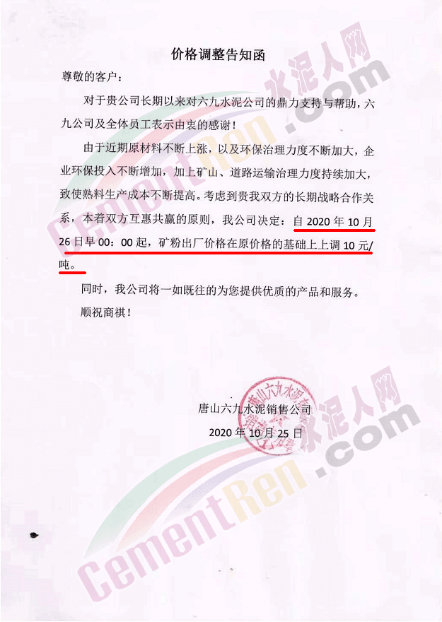 唐山六九水泥銷售公司通知,由于近期原材料不斷上漲,環(huán)保治理力度不斷加大,企業(yè)環(huán)保投入不斷增加,加上礦山、道路運(yùn)輸治理力度持續(xù)加大,致使熟料生產(chǎn)成本不斷提高。自2020年10月26日0時起,礦粉出廠價格在原價格的基礎(chǔ)上上調(diào)10元/噸。