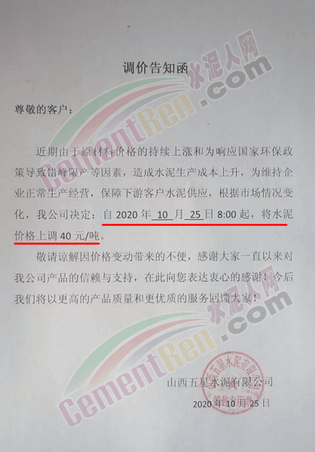 山西五星水泥通知,由于原材料價格的持續(xù)上漲和為響應(yīng)國家環(huán)保政策導(dǎo)致錯峰限產(chǎn)等因素,造成水泥生產(chǎn)成本上升,為維持企業(yè)正常生產(chǎn)經(jīng)營,保障下游客戶水泥供應(yīng),根據(jù)市場情況變化,公司決定自10月25日8時起將水泥價格上調(diào)40元/噸。