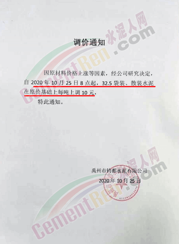 禹州市鈞都水泥通知,因原材料價格上漲等因素,自10月25日8點(diǎn)起,32.5袋裝、散裝水泥在原價基礎(chǔ)上每噸上調(diào)10元。