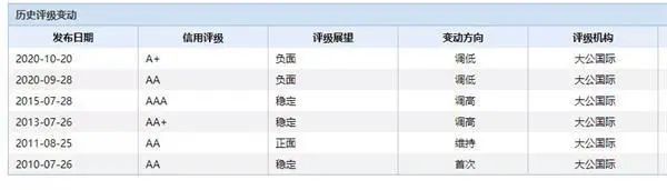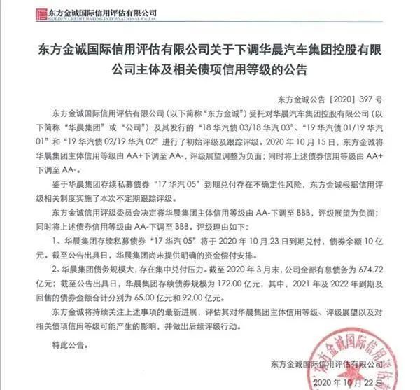 大公表示,按照2017年9月華晨集團與債權投資計劃受托人太平資產管理有限公司簽署的《太平一一華晨汽車制造產業升級債權投資計劃投資合同》約定,華晨集團應于2020年9月21日劃撥季度應付利息。截至2020年10月14日,華晨集團仍未將應付季度利息劃撥至債權投資計劃托管人賬戶。而東方金誠很罕見的在債券違約當天就掛出了評級下調公告,華晨集團的主體信用評級再一次斷崖式下跌至BBB。
