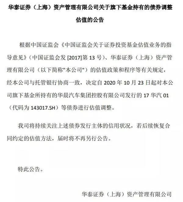 華泰證券資管稱公告稱,公司決定自 2020 年 10 月 23 日起對旗下基金所持有的華晨汽車集團控股有限公司發行的 17 華汽 01(代碼為 143017.SH)等債券進行估值調整。