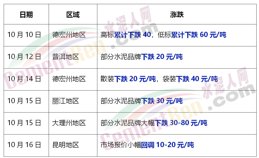 據(jù)水泥人網(wǎng)了解,在云南滇西部分區(qū)域水泥價格持續(xù)回落,有企業(yè)累計跌120元/噸,PO42.5散裝水泥最低價達到200元/噸左右,PC42.5包裝水泥出廠價低至180~190元/噸以下。區(qū)域主導(dǎo)企業(yè)海螺、華新、西南、紅獅、華潤水泥等陸續(xù)跟進下調(diào)水泥價格。區(qū)域內(nèi)低成本龍頭企業(yè)海螺水泥依托返利促銷模式在部分區(qū)域占據(jù)主導(dǎo)地位,擁有一定的市場話語權(quán)。