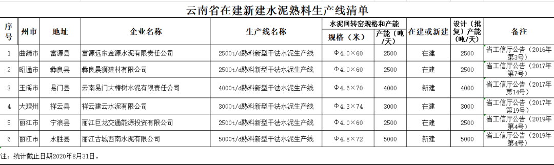 9月末云南省工信廳發(fā)布了云南省水泥熟料生產(chǎn)線清單公告,其中明確截止到2020年8月31日共有四條新型干法水泥熟料生產(chǎn)線在建,其中兩條為新建項目,設(shè)計產(chǎn)能合計585萬噸/年。