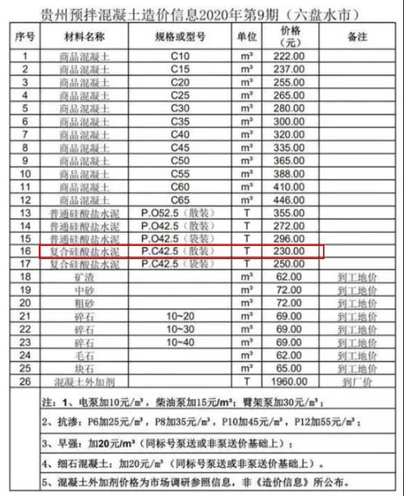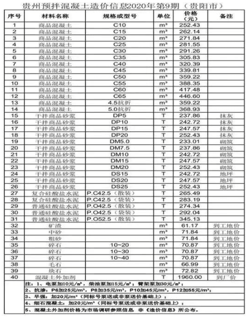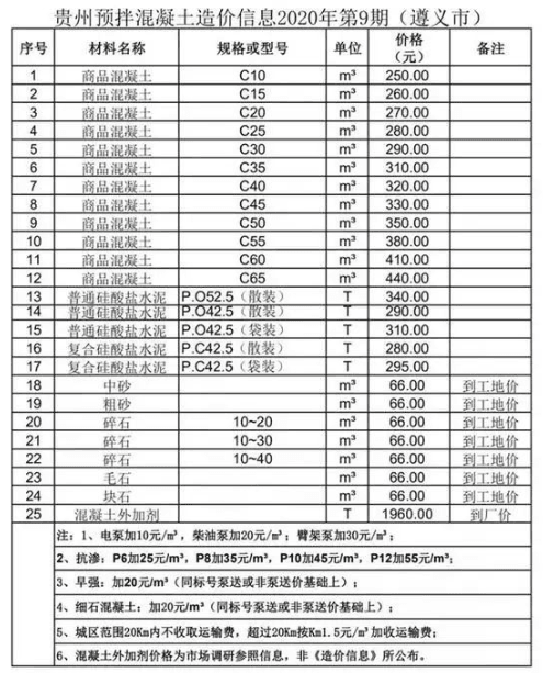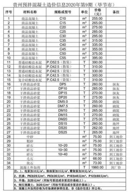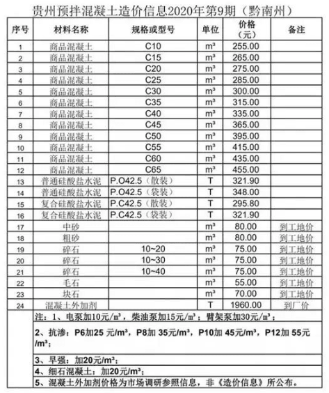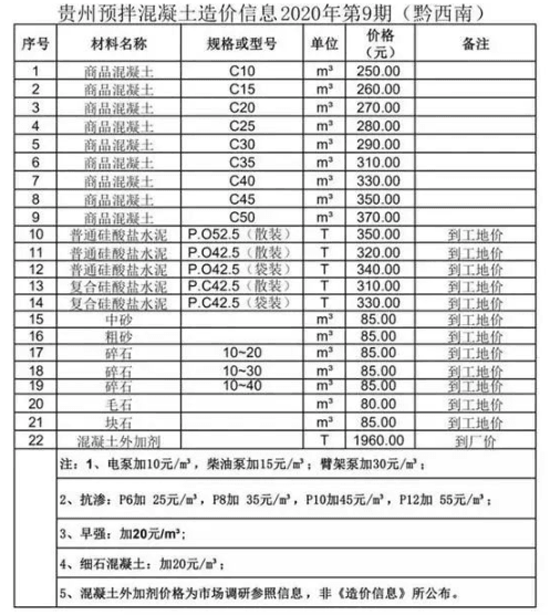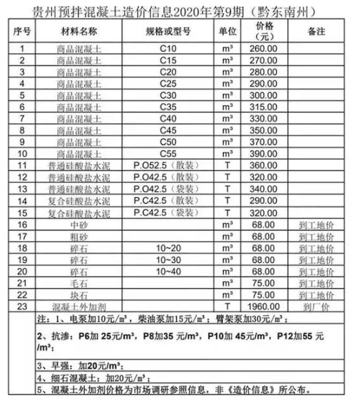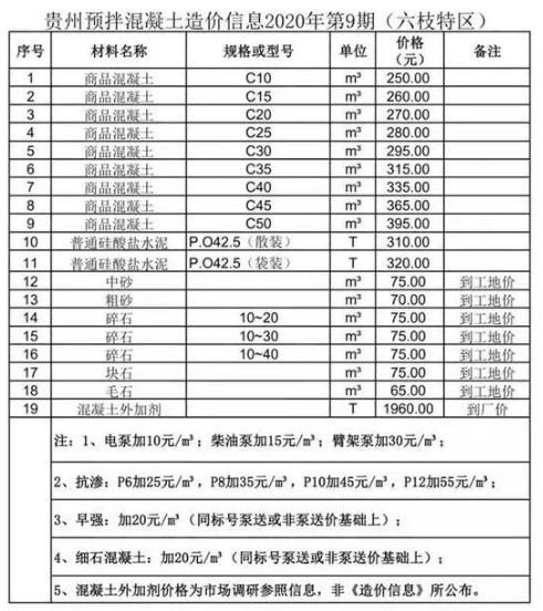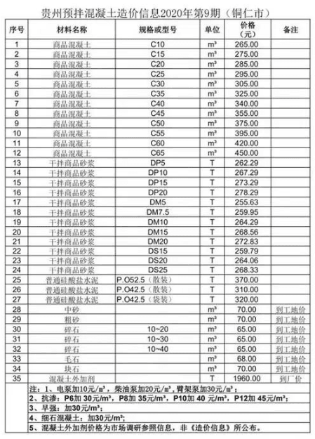 近日,貴州省預(yù)拌混凝土行業(yè)協(xié)會發(fā)布了貴州省預(yù)拌混凝土造價(jià)信息2020年第9期。造價(jià)信息顯示,商品混凝土平均價(jià)格高于干拌商品砂漿、硅酸鹽水泥等其他預(yù)拌混凝土。其中,黔南州商品混凝土C65價(jià)格最高,為455元/立方;黔南州毛石價(jià)格最低,為55元/立方。