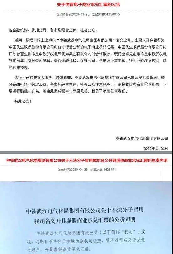 這是中鐵武漢今年以來第三次發(fā)布有關(guān)被冒名開具虛假商業(yè)承兌匯票的免責(zé)聲明。此前,該公司分別于今年1月份、4月份在其官方網(wǎng)站發(fā)布相關(guān)信息提示。
