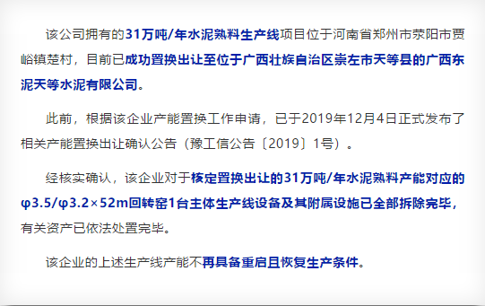 一、關于河南隆鑫水泥有限責任公司年產31萬噸水泥熟料已置換產能拆除退出情況。該公司擁有的31萬噸/年水泥熟料生產線項目位于河南省鄭州市滎陽市賈峪鎮楚村,目前已成功置換出讓至位于廣西壯族自治區崇左市天等縣的廣西東泥天等水泥有限公司。此前,根據該企業產能置換工作申請,我廳已于2019年12月4日正式發布了相關產能置換出讓確認公告(豫工信公告〔2019〕1號)。經我廳核實確認,該企業對于核定置換出讓的31萬噸/年水泥熟料產能對應的φ3.5/φ3.2×52m回轉窯1臺主體生產線設備及其附屬設施已全部拆除完畢,有關資產已依法處置完畢。該企業的上述生產線產能不再具備重啟且恢復生產條件。