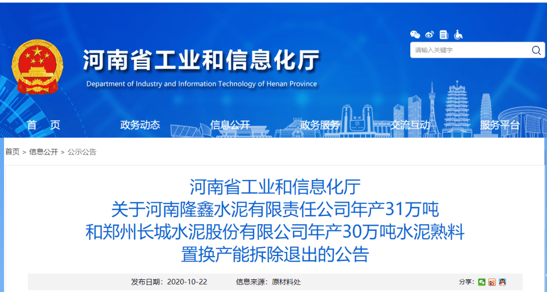 日前,河南省工信廳發布《關于河南隆鑫水泥有限責任公司年產31萬噸和鄭州長城水泥股份有限公司年產30萬噸水泥熟料置換產能拆除退出的公告》稱,按照相關文件工作程序規定和要求,將河南隆鑫水泥有限責任公司31萬噸/年水泥熟料已置換產能生產線、鄭州長城水泥股份有限公司30萬噸/年水泥熟料已置換產能生產線的拆除退出情況公告如下,歡迎社會公眾進行監督。