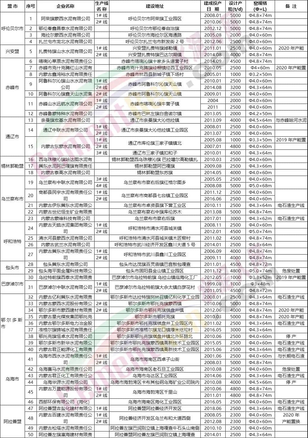 日前,內蒙古自治區工信廳發布《關于公開全區水泥熟料平板玻璃生產線清單的公告》,公告列表顯示,截止2019年12月底,內蒙自治區共有65條熟料生產線,合計產能6240萬噸/年。其中包括2019~2020年退出的8條生產線,退出產能合計669萬噸/年。
