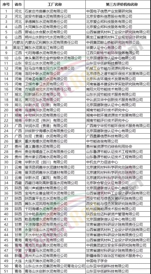 經申報單位自評價、第三方機構評價、省級工業和信息化主管部門評估確認及專家論證、公示等程序,確定了第五批綠色制造名單,并予以公布。其中,包括冀東水泥,山水水泥,海螺水泥,同力水泥,中聯水泥,華新水泥,華潤水泥等51家水泥企業在內的719家工廠獲評綠色工廠,名單如下: