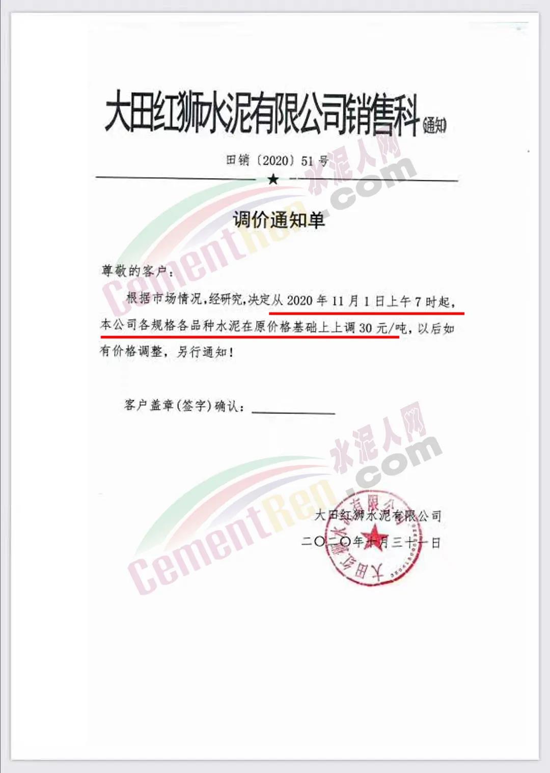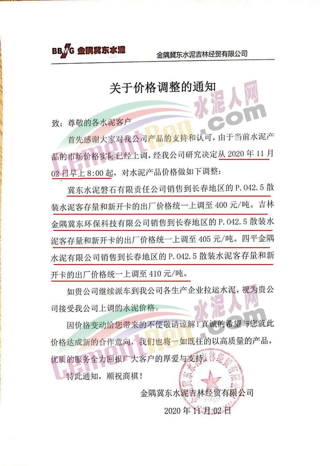 水泥人網通訊員消息:金隅冀東水泥吉林經貿有限公司發布《關于價格調整的通知》稱,由于當前水泥產品的市場價格實際已經上調,經公司研究決定從 2020年11月02日早上8∶00起,對水泥產品價格做出調整∶