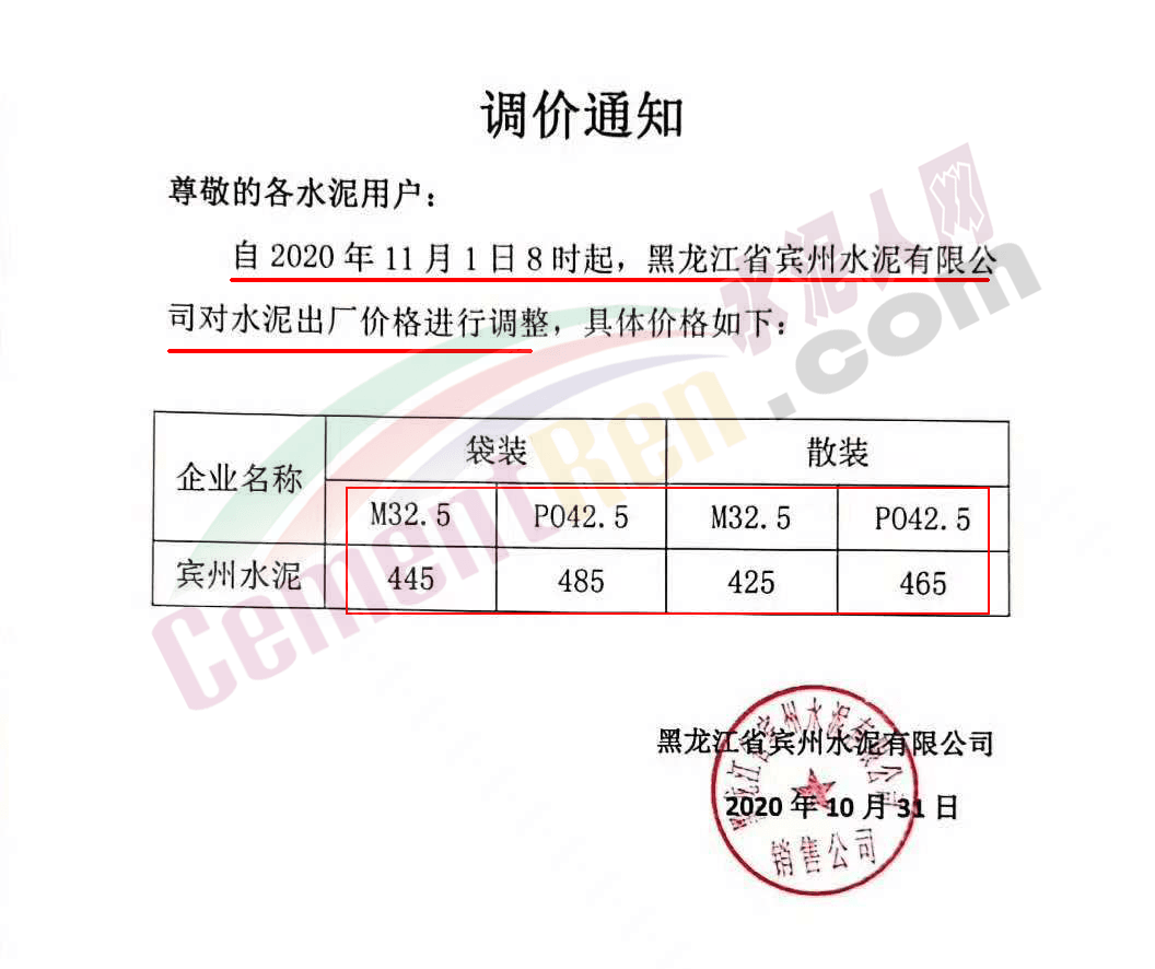 黑龍江賓州水泥有限公司也通知11月1日8時起上調水泥價格,漲價后M32.5袋裝水泥執行445元/噸,PO42.5水泥執行485元/噸,M32.5散裝水泥執行425元/噸,PO42.5散裝執行465元/噸。