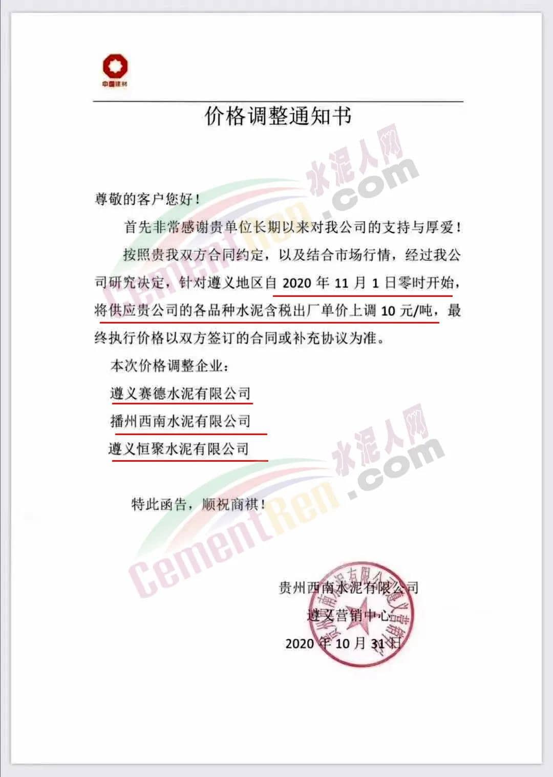 同期,貴州遵義區域主要品牌企業西南水泥旗下遵義賽德水泥、播州西南水泥、遵義恒水泥三家工廠通知各品種水泥含稅出廠價上調10元/噸。
