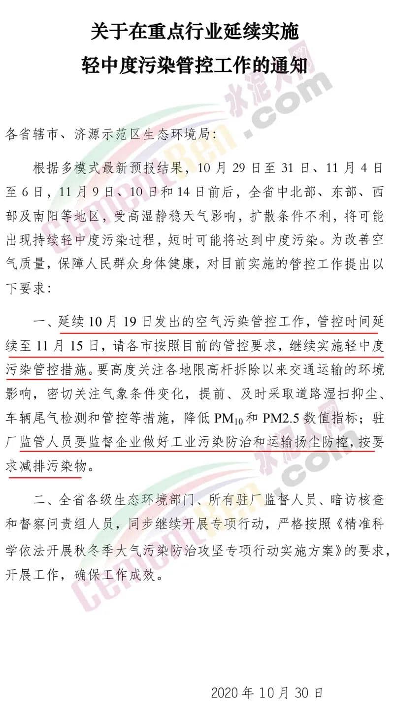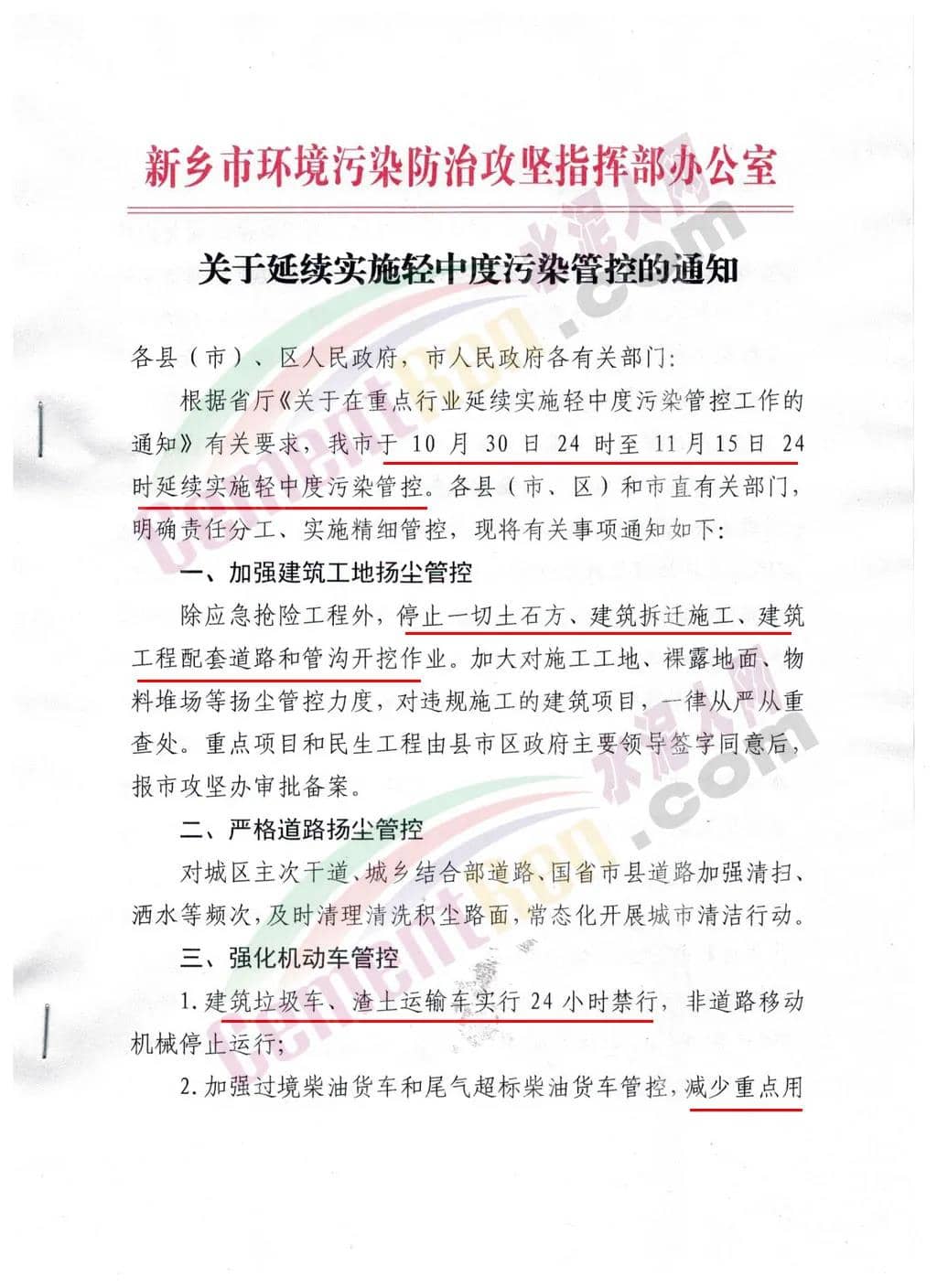 新鄉市環境污染防治攻堅指揮部辦公室發布《關于延續實施輕中度污染管控的通知》稱,根據省廳《關于在重點行業延續實施輕中度污染管控工作的 通知》有關要求,于10月30日24時至11月15日24時延續實施輕中度污染管控。