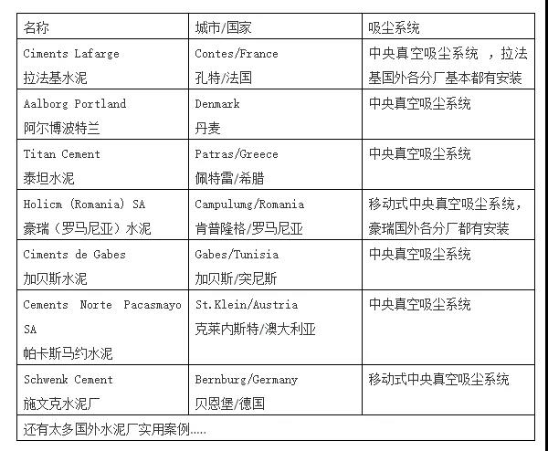 國外在針對無組織粉塵的處理已經發展上百年了,中央真空吸塵系統已經在國外30多個行業廣泛應用。而國內還是近十多年才有無組織粉塵治理的概念,而產生大量粉塵的水泥廠,中央真空吸塵系統在國內目前還處于完全空白,完全起步狀態,需要加油趕上。