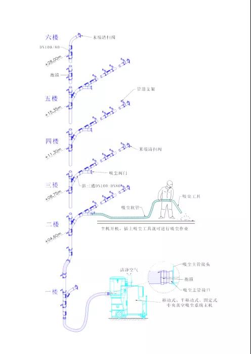 1、一套系統可以解決200米管道距離內、多樓層的粉塵清掃作業,可以滿足同時多人在線吸塵。做成移動的中央真空吸塵系統,可解決整個廠房的清掃問題。