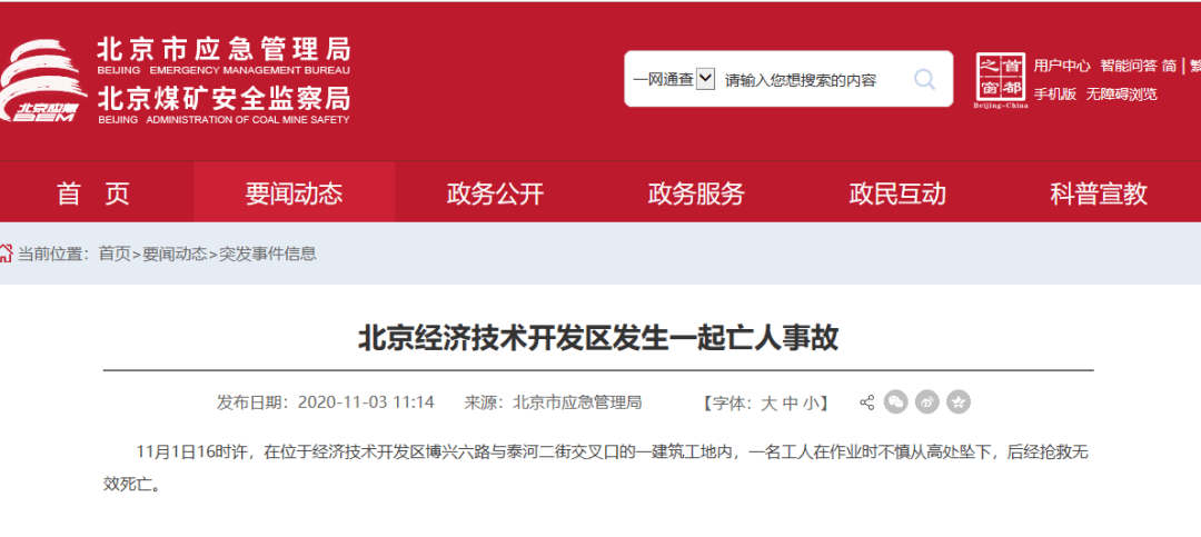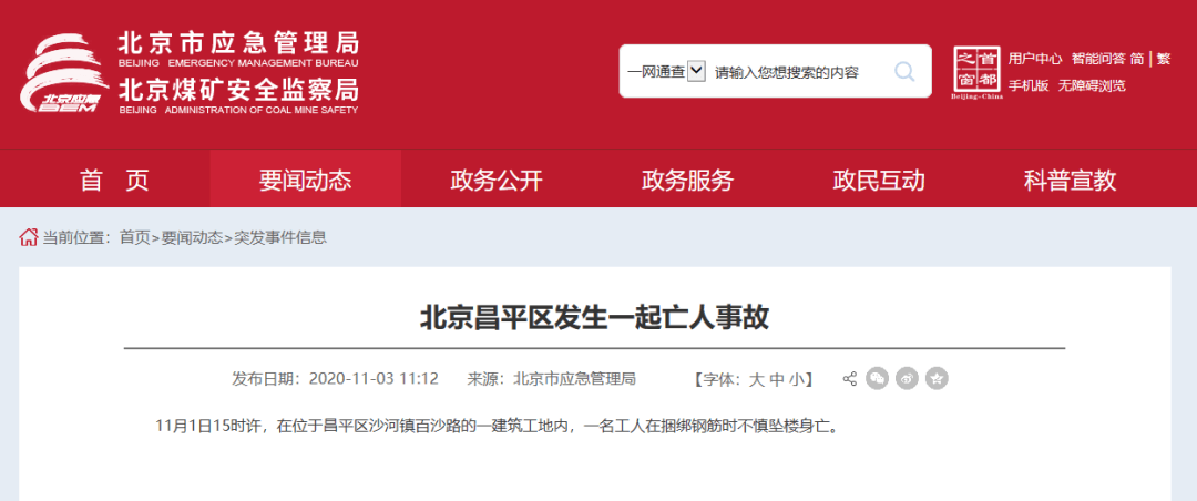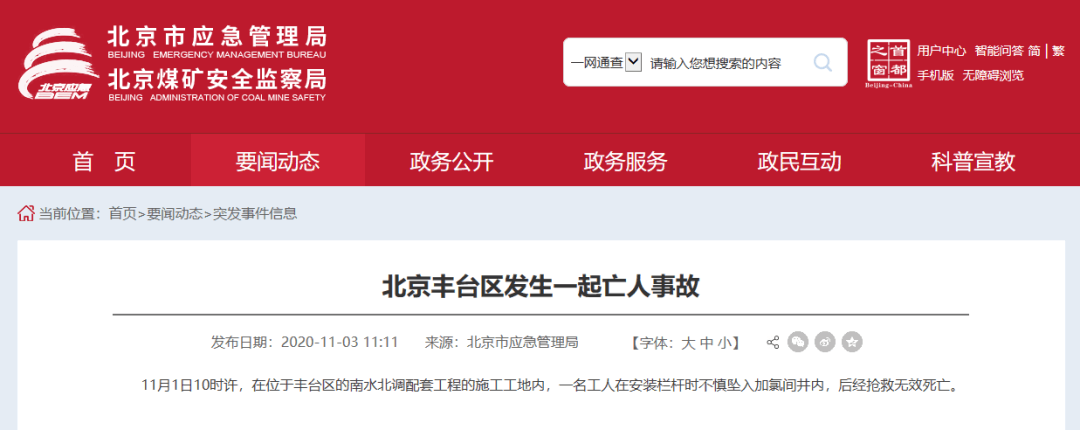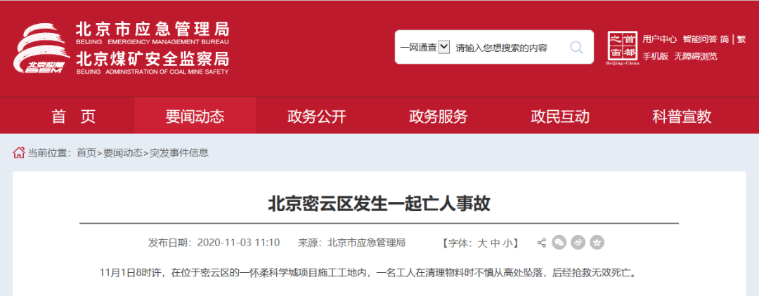 北京市管理局官網(wǎng)公布的突發(fā)事件信息顯示,11月1日共有4起事故,其中3起涉及建筑施工項目,均為高處墜落事故,導(dǎo)致3名工人死亡。另一起為南水北調(diào)配套工程的施工工地內(nèi),一名工人在安裝欄桿時不慎墜入加氯間井內(nèi),后經(jīng)搶救無效死亡。11月1日8時許,在位于密云區(qū)的一懷柔科學(xué)城項目施工工地內(nèi),一名工人在清理物料時不慎從高處墜落,后經(jīng)搶救無效死亡。