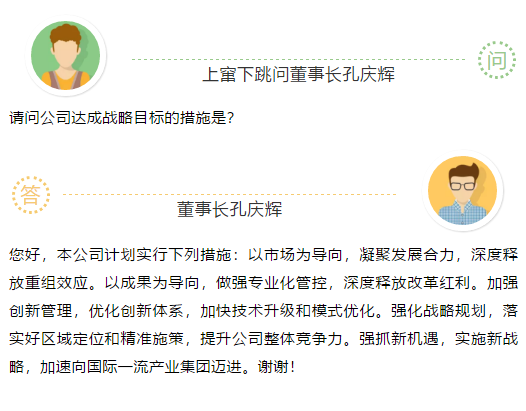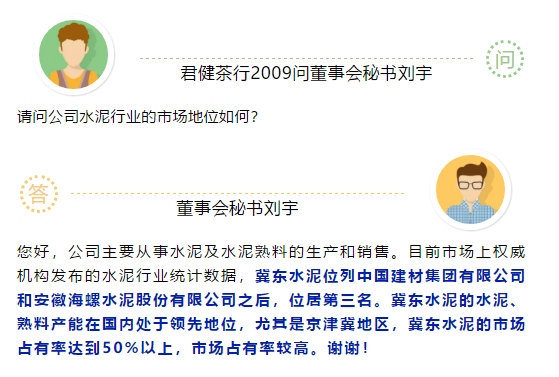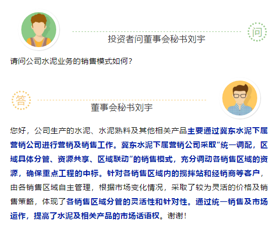 5.成本優勢:公司持續做實做優生產運營管控,為實現高質量發展,持續推進“培優”工作,以培優為平臺的對標、總結、互相借鑒、 學習,營造了標桿引領、爭先創優的地良好企業發展氛圍;持續加大技改投入,以篦冷機、預熱器、預粉磨設備等主機提效 為重點加速消除落后工藝、低效裝備;引進、推廣成熟、有效的節能降耗技術措施,降耗能力提升;持續推進直供電工作, 成本控降效果顯著;結合各區域產品質量的差異化需求,按區域制定質量標準,著力解決水泥產品面臨的同質化、低附加值 等重大共性問題,開發適應市場的高性能定制化水泥。使得公司在布局區域的成本競爭優勢明顯,為公司產能釋放、效益提升奠定了基礎。6.人才優勢:公司堅持實施“人才強企”戰略,培養造就了一批綜合素質好的優秀經營管理人才和素質一流的高級專業技術人才隊伍, 建設了一支符合公司發展需要的優秀年輕骨干人才梯隊;通過引進科技領軍人才、高級技術專家等高端優秀人才,匯聚高端智力資源,充分發揮高層次人才在推動公司發展的引領作用。報告期,公司人才結構持續優化、布局更加合理,一批職業素 養好、開拓能力強的經營管理人員成為公司人才競爭的比較優勢。謝謝!
