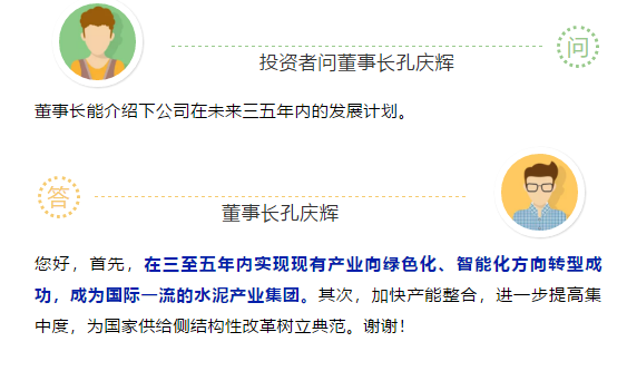 3.環保及環保產業優勢:公司通過前期加大環保投入和后期加快工藝、污染治理設施升級改造,推動環境保護管理五級責任體系建立,繼續全面開展行業內獨創的生態環境標準化建設工作等方式,不斷強化環保內部管控,加強環境監管落實力度,所屬企業污染物排放均符合或優于國家及地方標準,新增國家級“綠色工廠”4家,入圍國家綠色礦山遴選名單14家,著重體現綠色新型環保產品優勢,提升企業可持續健康發展能力。公司以“城市凈化器、政府好幫手”為理念,依托紅樹林公司大力發展環保產業,全力推動符合條件的水泥熟料企業轉型 升級,高速推進京津冀、山西、陜西等12個省市以水泥窯協同處置為主的環保項目建設。水泥窯協同處置技術不斷更新升級, 進一步強化覆蓋41類工業危廢、市政污泥、生活垃圾、飛灰、污染土壤等多方面的綜合固廢處置能力。同時,參與包括《水泥窯協同處置固體廢 物技術規范》(GB30760)、《水泥窯協同處置固體廢 物環境保護技術規范》(HJ662)在內的6項國家、 行業、地方標準的編制,將公司豐富的管理模式、經驗推廣到全行業,奠定公司行業地位的同時,形成了公司在環保產業方 面的獨特優勢。