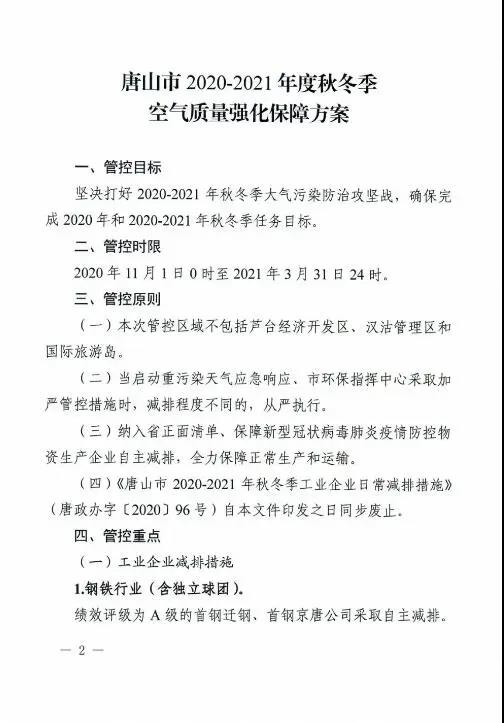 日前,唐山發布《唐山市2020-2021年秋冬季空氣質量強化保障方案》要求2020年11月1日0時至2021年3月31日24時期間實施《2020-2021年秋冬季空氣質量強化保障方案》。