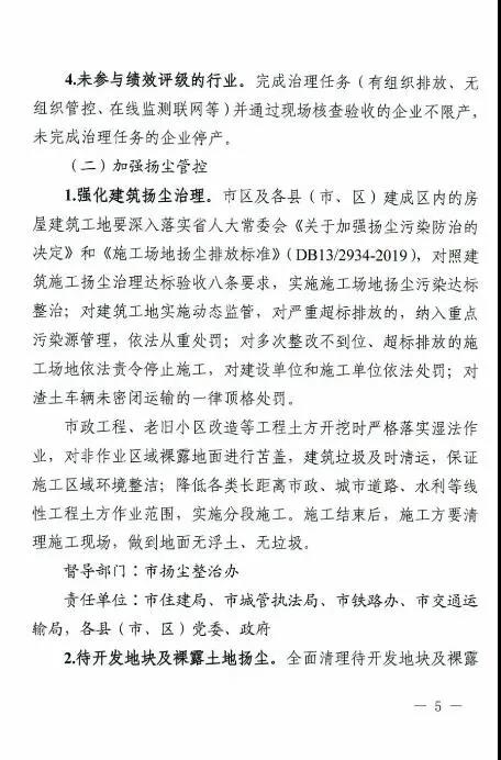 1.強化建筑揚塵治理。市區及各縣(市、區)建成區內的房屋建筑工地要深入落實省人大常委會《關于加強揚塵污染防治的決定》和《施工場地揚塵排放標準》(DB13/2934-2019),對照建筑施工揚塵治理達標驗收八條要求,實施施工場地揚塵污染達標整治;對建筑工地實施動態監管,對嚴重超標排放的,納入重點污染源管理,依法從重處罰;對多次整改不到位、超標排放的施工場地依法責令停止施工,對建設單位和施工單位依法處罰;對渣土車輛未密閉運輸的一律頂格處罰。