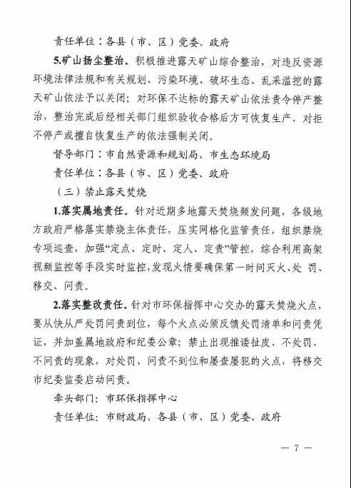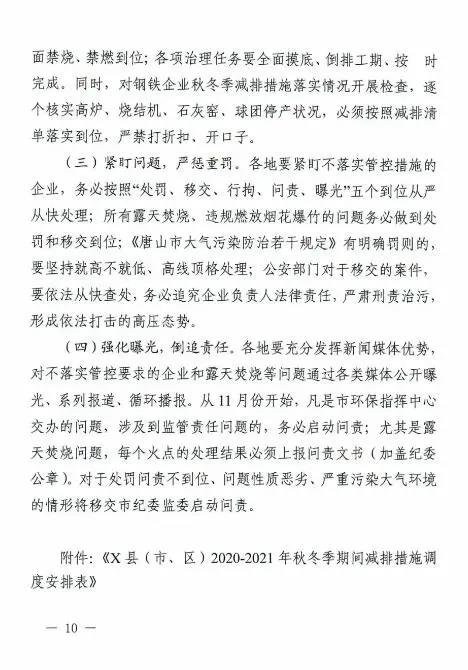 (三)緊盯問題,嚴懲重罰。各地要緊目丁不落實管控措施的企業,務必按照“處罰、移交、行拘、問責、曝光”五個到位從嚴從快處理;所有露天焚燒、違規燃放煙花爆竹的問題務必做到處罰和移交到位;《唐山市大氣污染防治若干規定》有明確罰則的,要堅持就高不就低、高線頂格處理;公安部門對于移交的案件,依法從快查處,務必追究企業負責人法律責任,嚴肅刑責治污,形成依法打擊的高壓態勢。