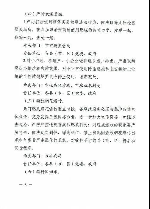 (二)對照清單,嚴格核查。各縣(市、區)要按照本地管控方案,逐家企業、逐條生產線、逐個生產裝備進行現場核查,確保生產裝備停產到位,國四運輸車輛禁行到位;秸稈、鞭炮要全面禁燒、禁燃到位;各項治理任務要全面摸底、倒排工期、按時完成。同時,對鋼鐵企業秋冬季減排措施落實情況開展檢查,逐個核實高爐、燒結機、石灰窯、球團停產狀況,必須按照減排清單落實到位,嚴禁打折扣、開口子。