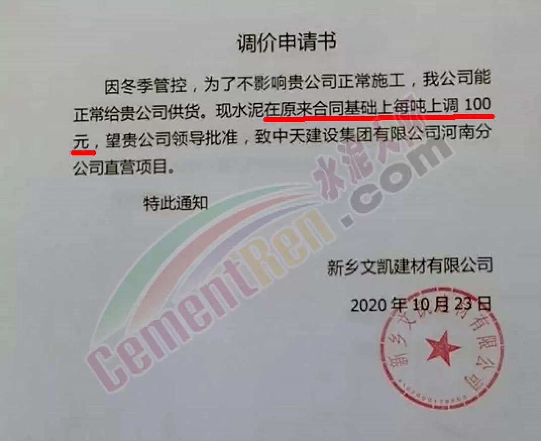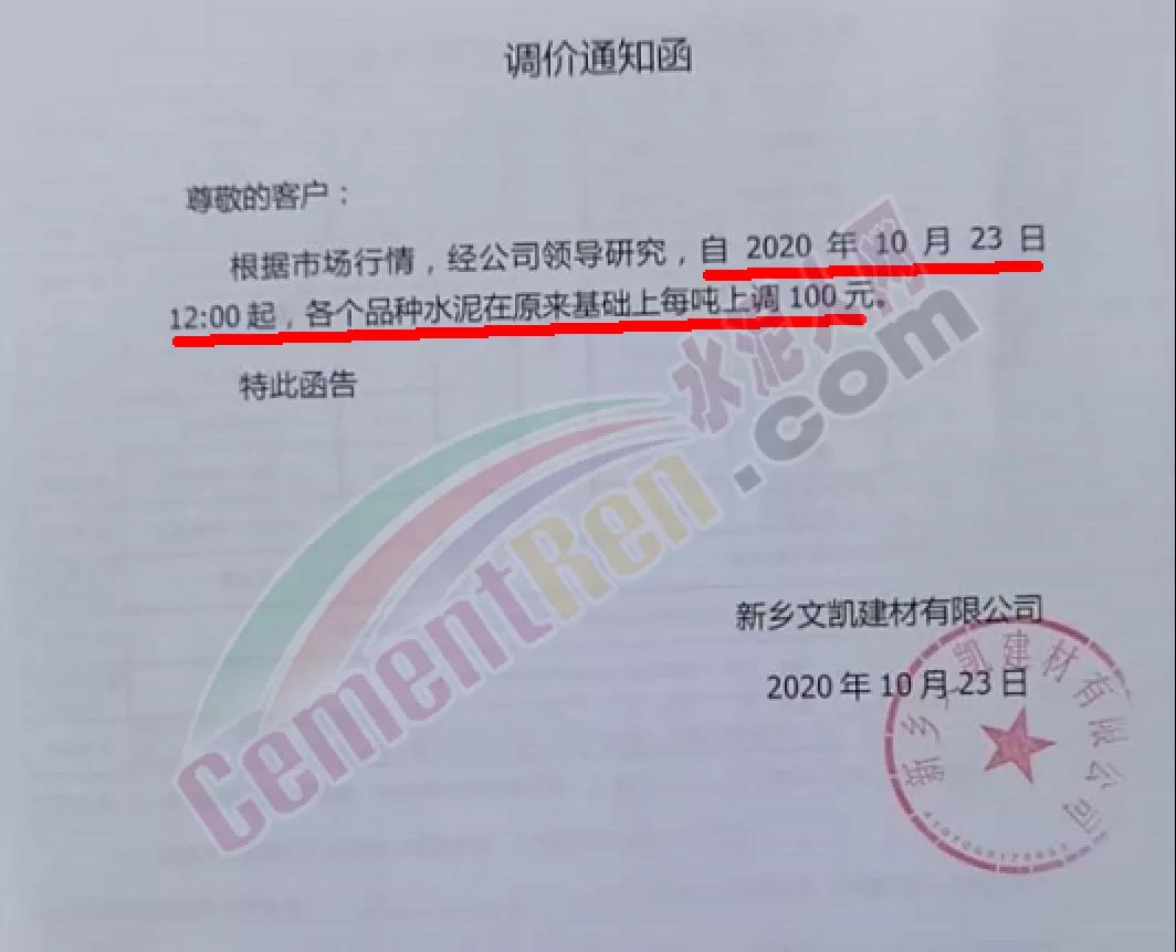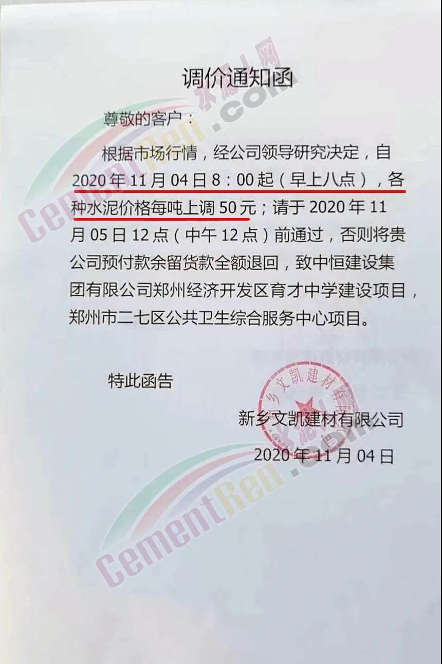水泥人網通訊員消息:日前新鄉區域水泥經銷商文凱建材公司通知自11月4日早8時起上調各品種水泥價格50元/噸。且要求客戶在11月5日12時前確認,否則將退回余留貨款。