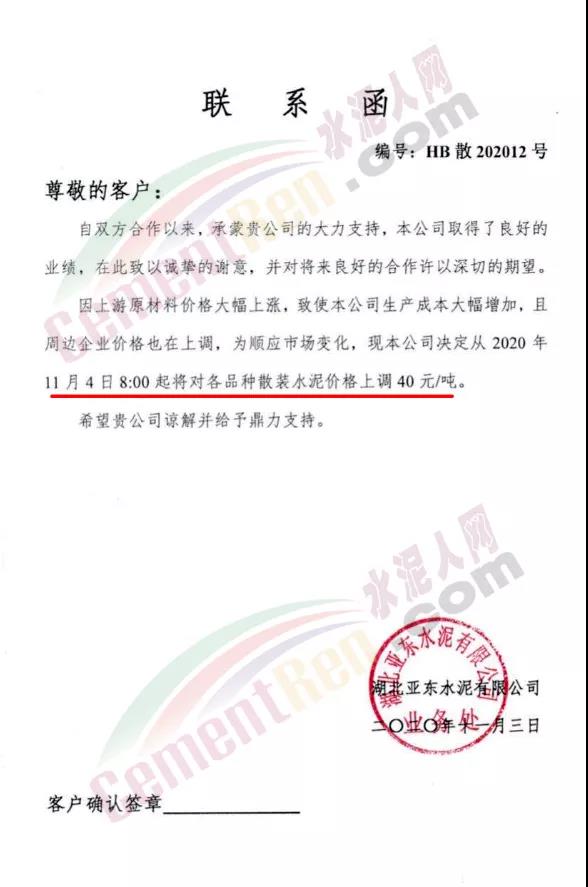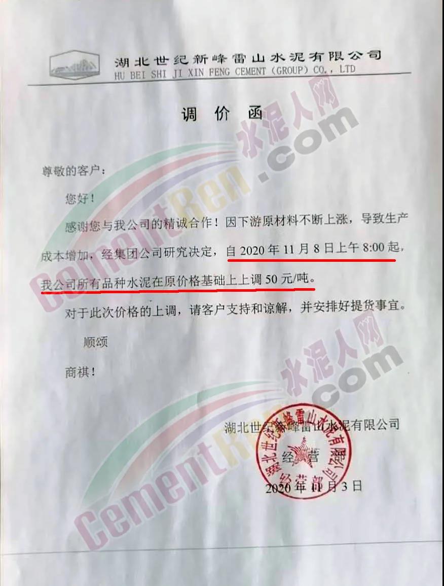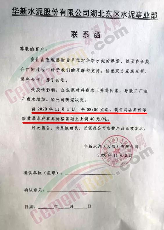 華新水泥湖北東區(qū)水泥事業(yè)部鄂州公司、黃石分公司、大冶公司聯(lián)系函稱,受疫情影響,企業(yè)原材料成本上升等因素,導致工作生產(chǎn)成本增加,經(jīng)公司研究決定 ,自11月5日上午8時起,公司各品種等級散裝水泥在原價基礎上上調40元/噸。