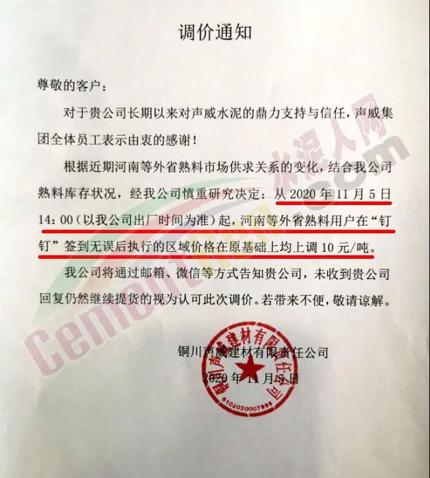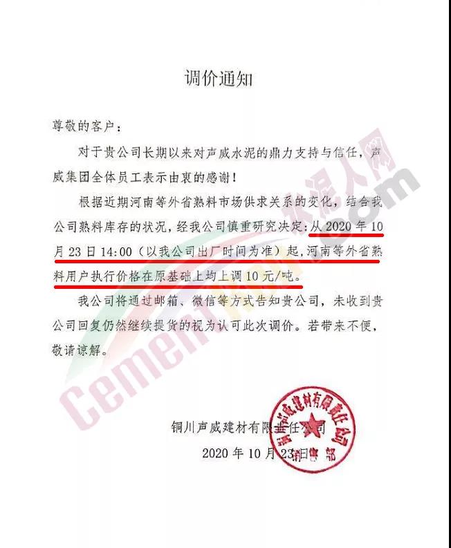 據(jù)水泥人網(wǎng)了解,10月23日陜西銅川聲威建材有限公司也曾發(fā)通知對河南等外省熟料用戶執(zhí)行價格在原基礎上上調10元/噸。