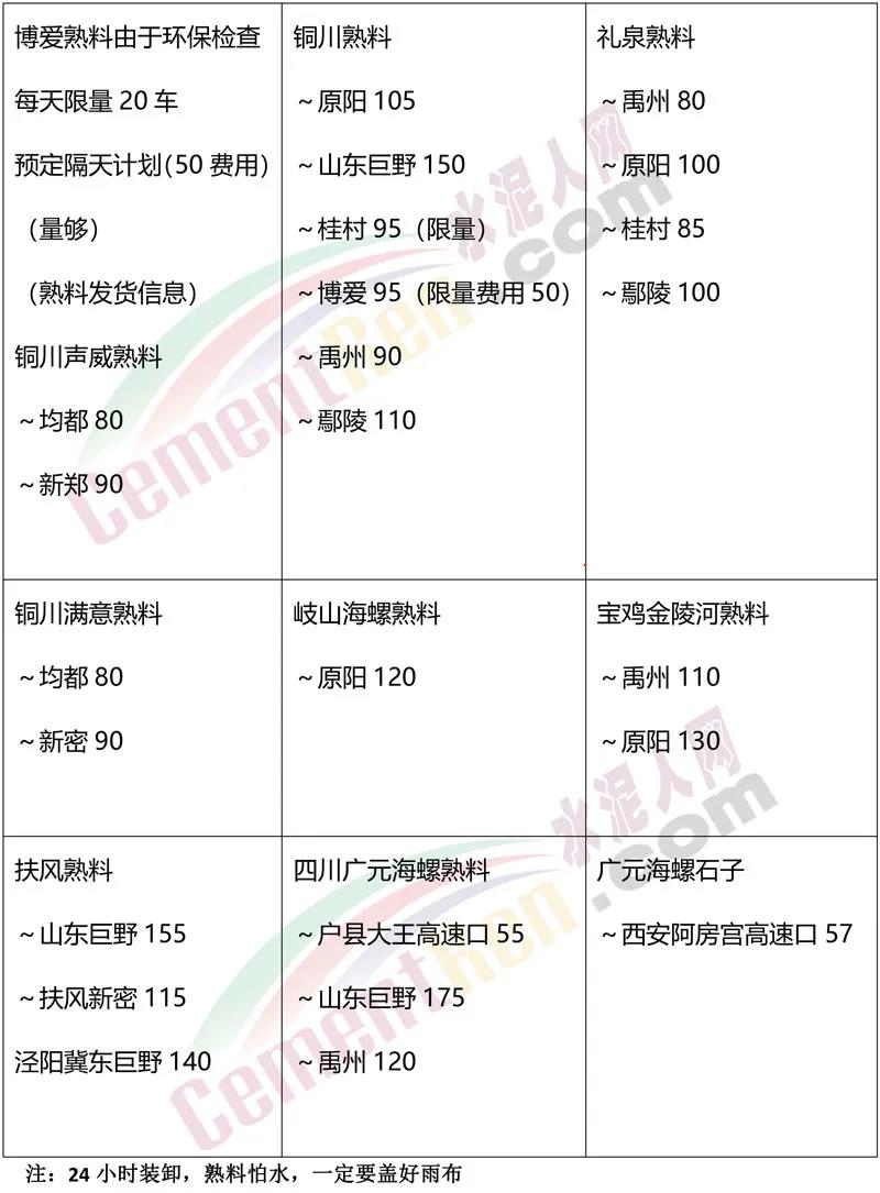 自去年四季度河南區(qū)域經(jīng)銷商將山西熟料“拉空”后,跨省到陜西采購以來,關中區(qū)域就一直有熟料供應河南區(qū)域。而且不僅銅川聲威建材,海螺、冀東、堯柏以及四川廣元區(qū)域均有熟料和水泥經(jīng)由貿(mào)易商轉售到河南多區(qū)域。從貿(mào)易商近期發(fā)布相關信息可見,熟料從陜西區(qū)域運至河南區(qū)域運費約在80~100元左右,到達山東荷澤區(qū)域運費在120~155元左右。且通知因環(huán)保管控每天限量20車,需提前以現(xiàn)金預定。