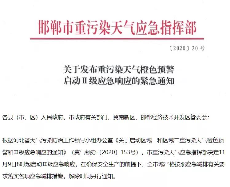 邯鄲市重污染天氣應急指揮部通知,于11月9日8時起啟動Ⅱ級應急響應,在確保安全生產的前提下,全市域嚴格按照應急減排有關要求落實各項應急減排措施。工業企業合理調控生產計劃,在確保安全生產和民生保障的前提下,按照《邯鄲市2020-2021年重污染天氣應急減排工業源清單(修訂版)》橙色預警(Ⅱ級)差異化減排措施執行到位。