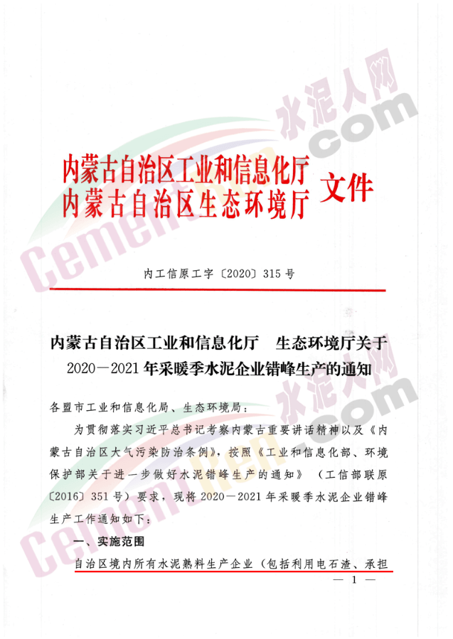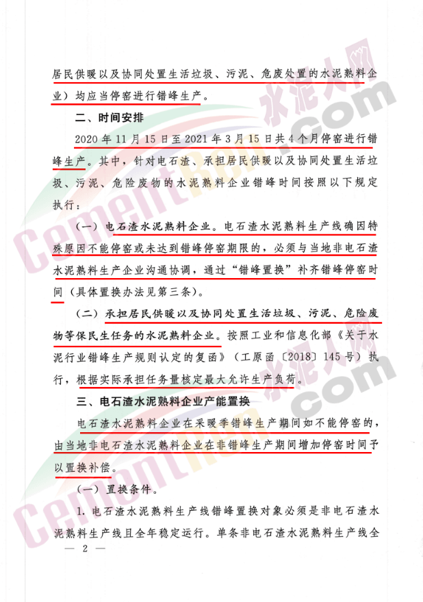 承擔居民供暖及協同處置生活垃圾、污泥、危險廢物等保民生任務的水泥熟料企業,按照工業和信息化部《關于水泥行業錯峰生產規則認定的復函》(工原函[2018]145號)執行,根據實際承擔任務量核定最大允許生產負荷。