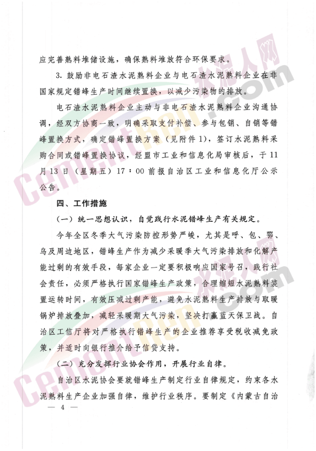 三、參與置換的非電石渣水泥熟料企業增加的停窯時間必須在冬季錯峰停窯后連續進行,即增加的停窯時間與冬季錯峰合并實施。