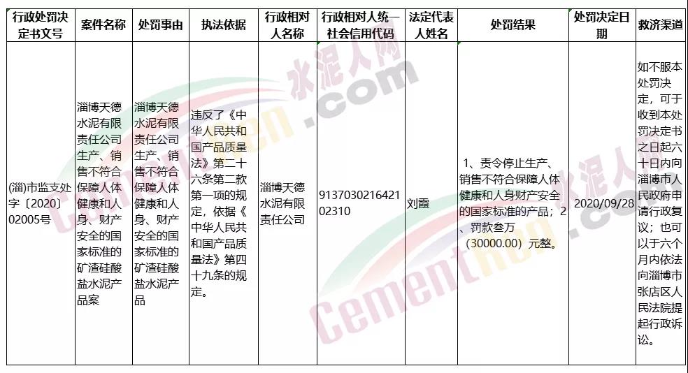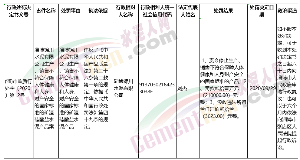 日前,山東省淄博市市場監管局網站發布針對淄博錦川水泥有限公司、淄博天德水泥有限責任公司和淄博黌陽水泥廠三家水泥企業的行政處罰案。公示內容顯示,三家企業均生產、銷售了不符合保障人體健康和人身、財產安全的國家標準的水泥產品。處罰結果包括沒收違法所得和罰款,其中淄博錦川水泥有限公司和淄博黌陽水泥廠分別處罰21萬元罰款,并沒收非法所得3623元和5808元。淄博天德水泥有限責任公司罰款3萬。三家企業均被責令其停產、停售不符合保障人體健康和人身財產安全的國家標準的產品。