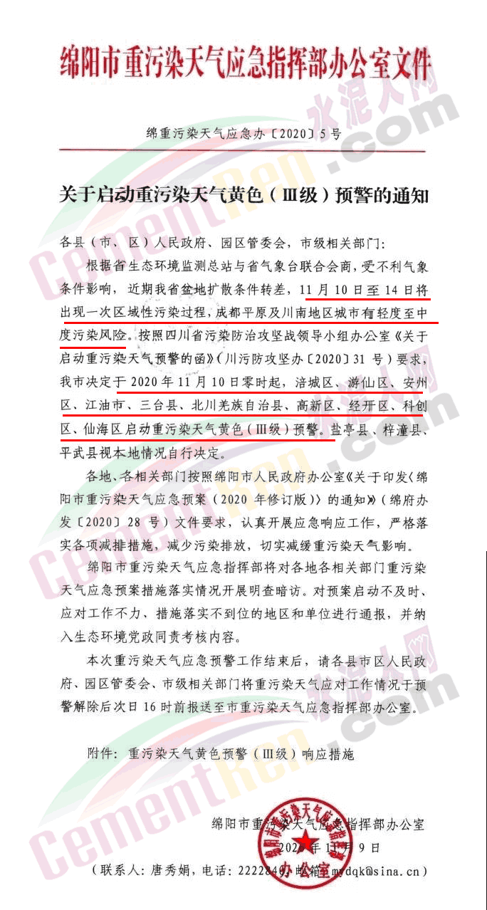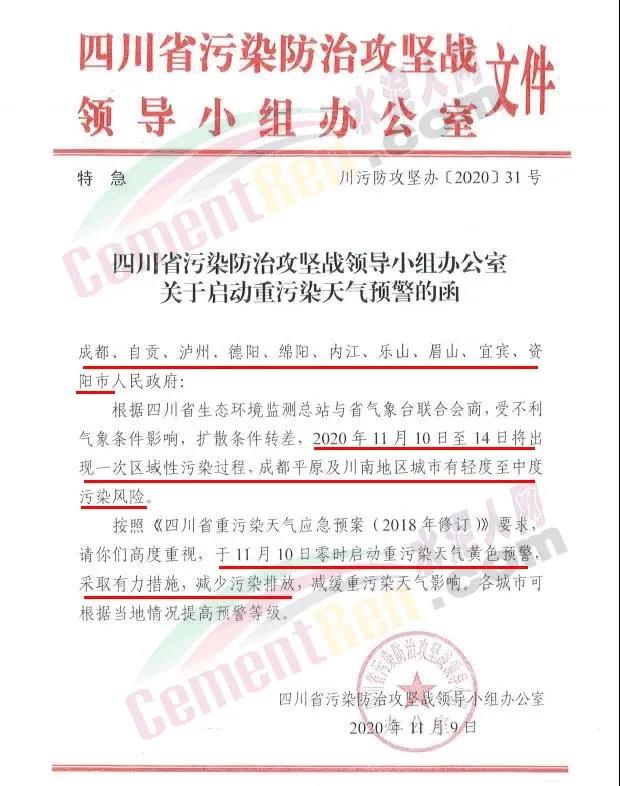 日前,水泥人網(wǎng)從四川省污染防治攻堅(jiān)戰(zhàn)領(lǐng)導(dǎo)小組辦公室獲悉,11月10日零時(shí),成都、自貢、瀘州、德陽(yáng)、綿陽(yáng)、內(nèi)江、樂(lè)山、眉山、宜賓、資陽(yáng)10市將啟動(dòng)重污染天氣黃色預(yù)警。根據(jù)四川省生態(tài)環(huán)境監(jiān)測(cè)總站與省氣象臺(tái)聯(lián)合會(huì)商,受不利氣象條件影響,擴(kuò)散條件轉(zhuǎn)差,2020年11月10日至14日將出現(xiàn)一次區(qū)域性污染過(guò)程,成都平原及川南地區(qū)城市有輕度至中度污染風(fēng)險(xiǎn)。按照《四川省重污染天氣應(yīng)急預(yù)案(2018年修訂)》要求,成都、自貢、瀘州、德陽(yáng)、綿陽(yáng)、內(nèi)江、樂(lè)山、眉山、宜賓、資陽(yáng)應(yīng)于11月10日零時(shí)啟動(dòng)重污染天氣黃色預(yù)警,采取有力措施,減少污染排放,減緩重污染天氣影響。各城市可根據(jù)當(dāng)?shù)厍闆r提高預(yù)警等級(jí)。
