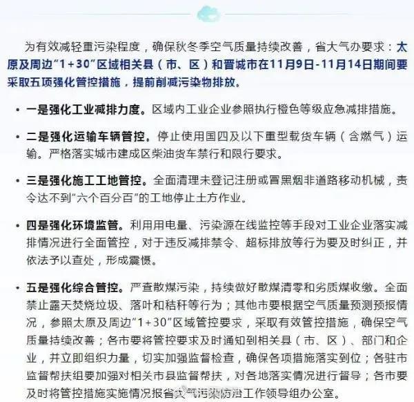 日前,山西省省大氣污染防治工作領(lǐng)導(dǎo)組辦公室印發(fā)《山西省大氣污染防治工作領(lǐng)導(dǎo)組辦公室關(guān)于做好近期不利氣象條件應(yīng)對(duì)的通知》指出,根據(jù)省生態(tài)環(huán)境監(jiān)測(cè)中心與中國(guó)環(huán)境監(jiān)測(cè)總站、省氣象部門會(huì)商預(yù)測(cè),從11月9日開(kāi)始,全省氣象條件轉(zhuǎn)差,全省大范圍以輕至中度污染為主,太原、陽(yáng)泉、晉城、運(yùn)城、臨汾等部分城市短時(shí)可能達(dá)到重度污染。