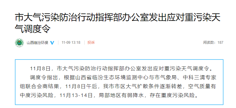 山西臨汾市大氣污染防治行動(dòng)指揮部辦公室發(fā)出應(yīng)對(duì)重污染天氣調(diào)度令。