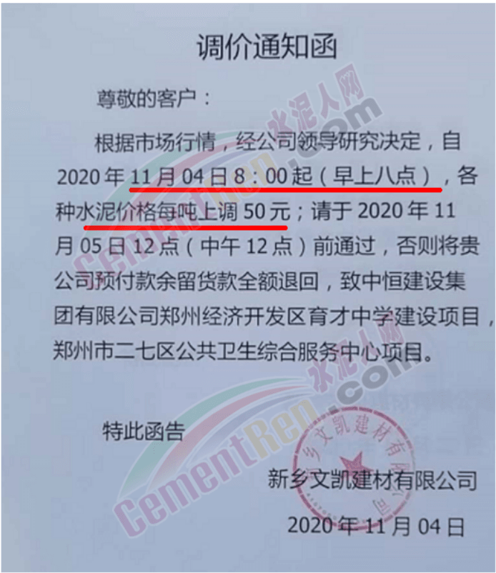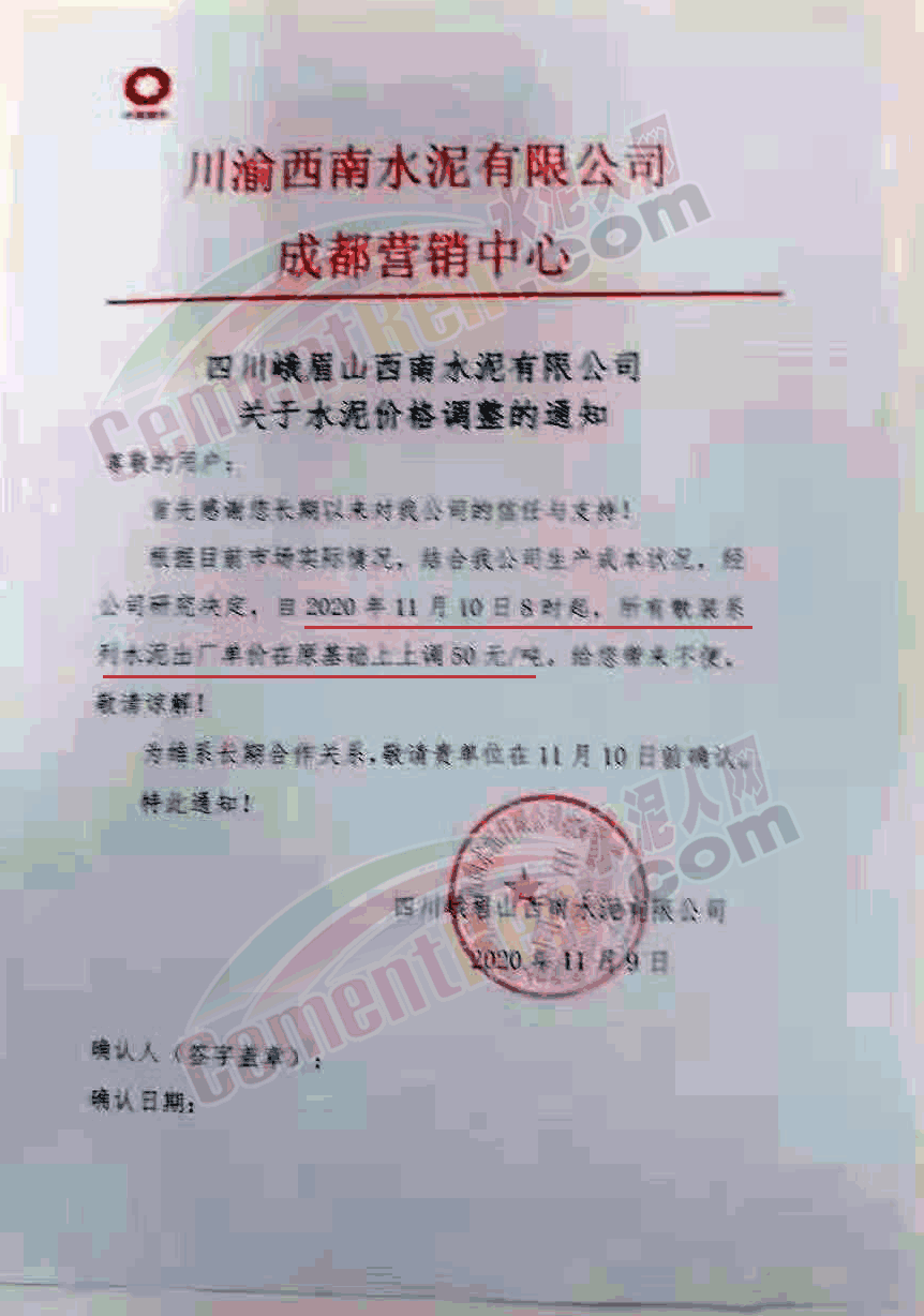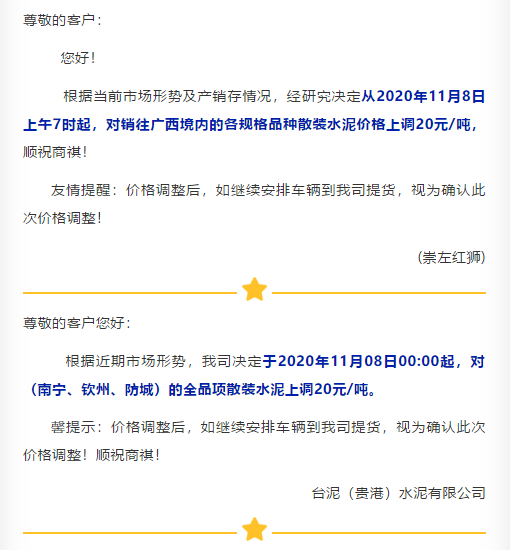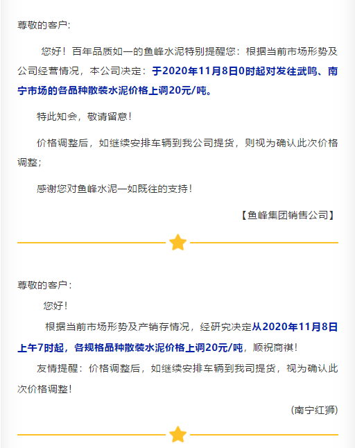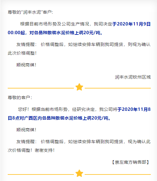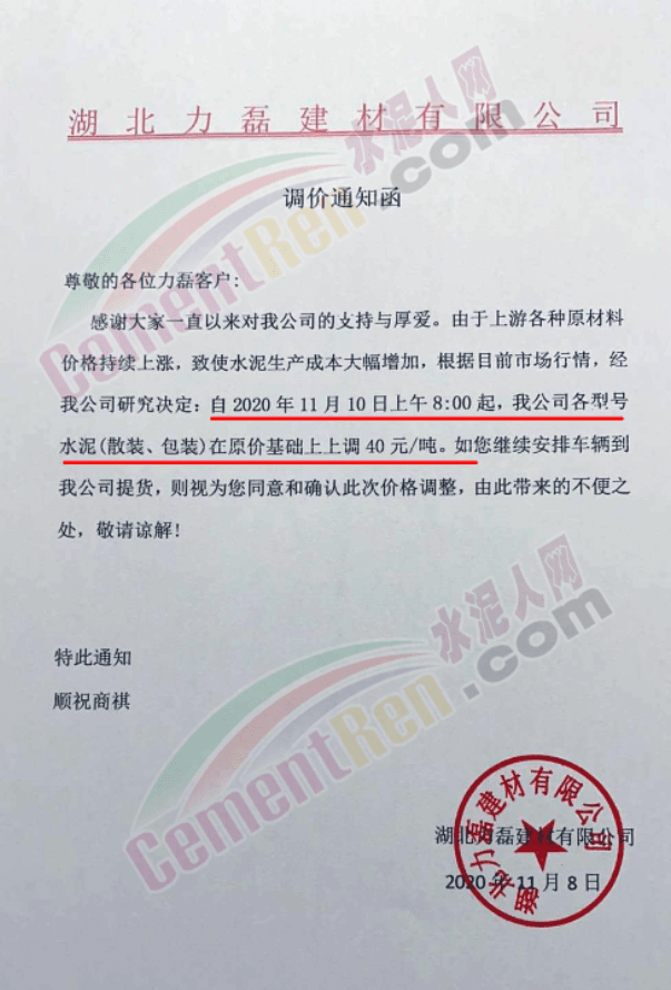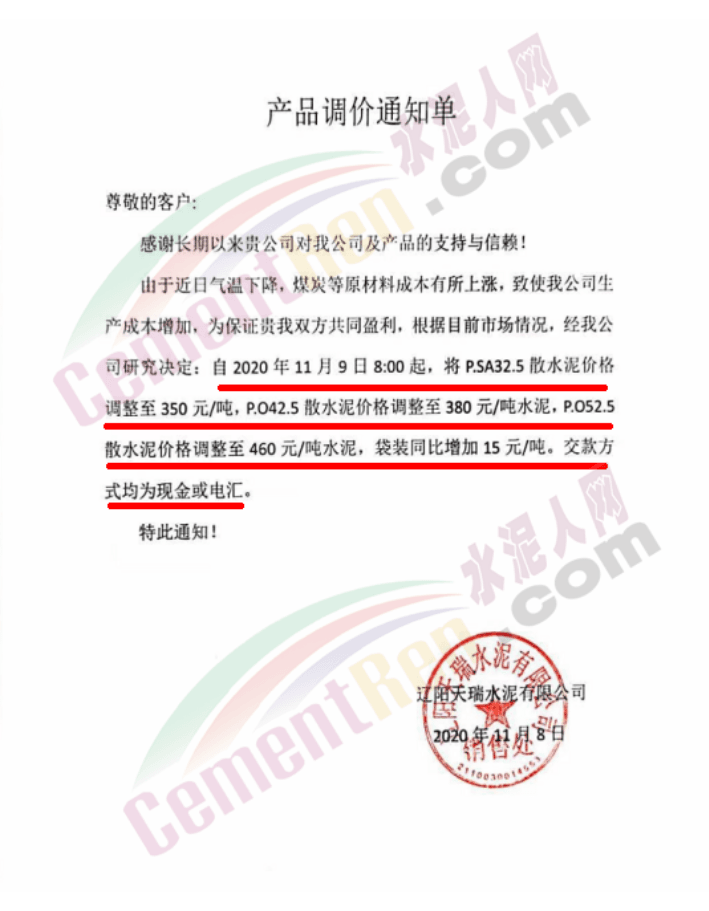近兩日遼寧區域主要品牌企業陸續通知上調水泥價格,且有企業表示庫存量有限,本月15日前后或再漲一次。遼陽天瑞水泥通知,由于近日氣溫下降,煤炭等原材料成本有所上漲,致使工廠生產成本增加。自11月9日時起,將P.S.A散裝水泥價格上調至350元/噸,P.O42.5散裝水泥上調至380元/噸,P.O52.5散裝水泥上調至460元/噸,袋裝同比增加15元/噸。交款方式必須為現金或電匯。