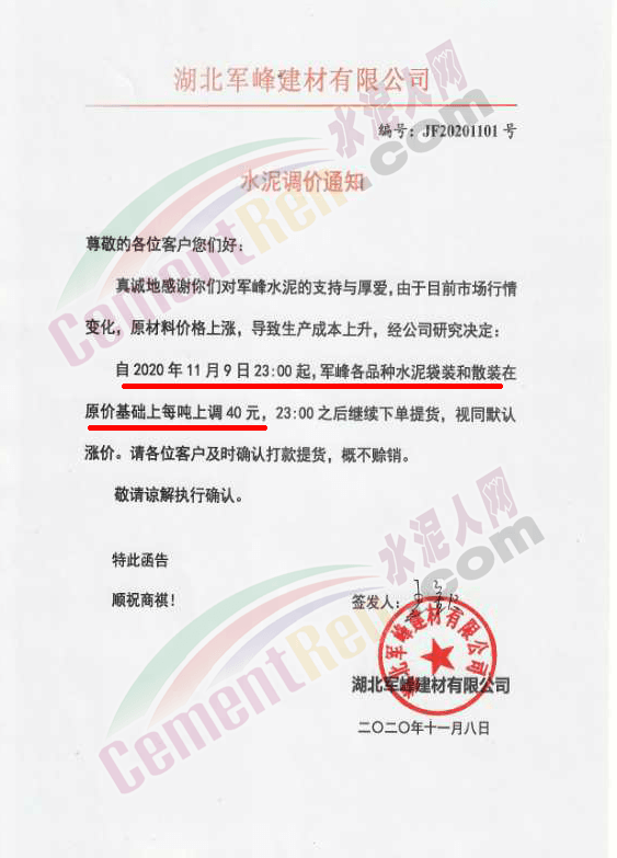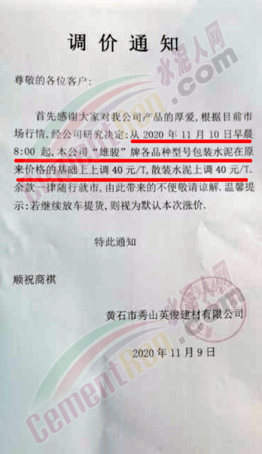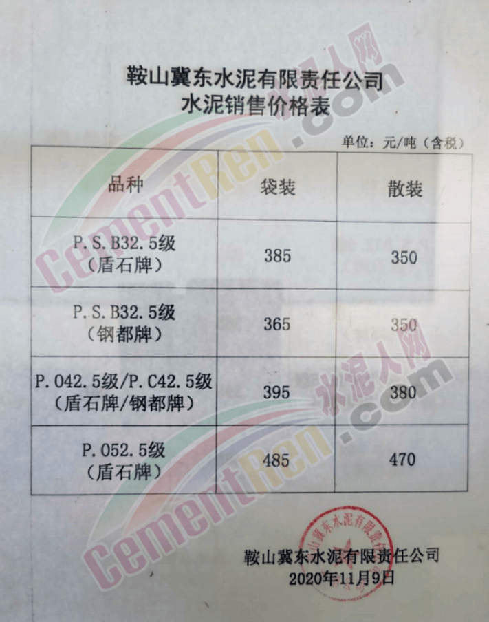 11月9日遼寧鞍山冀東水泥通知執行最新報價,其中P.S.B32.5包裝水泥上調至385元/噸,P.O42.5散裝水泥上調至380元/噸,P.O52.5散裝水泥上調至470元/噸。