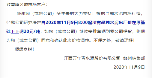 伊通滿族自治縣主要品牌企業通知下游商砼客戶稱,受道路交通限載及環保要求等因素影響,水泥原材料及運輸成本大幅上漲,尤其入冬以來煤炭成本漲幅巨大,導致水泥生產成本增加,為公司正常生產經營帶來壓力。為緩解生產經營成本壓力,保證公司正常運營及出廠水泥質量,經公司研究決定上調PO2.5裝水泥出廠價160元/噸,運費同步上調20元/噸。