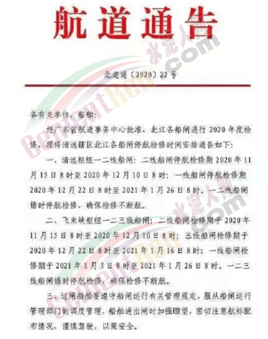 據水泥人網了解,日前相關部門通知,經廣東省航道事務中心批準,北江各船閘進行 2020年度檢修。其中清遠樞紐一二線船閘,二線船閘停航檢修期2020年11 月15日8時至2020年12月10日8時;一線船閘停航檢修期2020年12月22日8時至2021年1月26日8時。一二線船閘錯時停航檢修,確保檢修不斷航。飛來峽樞紐一二三線船閘∶二線船閘檢修期于2020年11月15日8時至2020年12月10日8時;三線船閘檢修期于2020年12月22日8時至2021年1月16日8時;一線船閘檢修期于2021年1月3日8時至2021年1月26日8時,一二三線船閘錯時停航檢修,確保檢修不斷航。