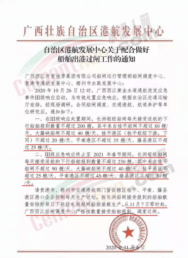同期,廣西壯族自治區港航發展中心通知稱,2020年10月26日12時,廣西西江黃金水道通航突發應急事件Ⅲ級響應啟動,為有效處置應急響應,根據自治區交通運輸廳安排,經現場調研,會同船閘調度、交通港航、航道養護等單位研究后,要求在Ⅲ級響應處置期間,長洲樞紐船閘每天接受適航的下行船舶報到數量不超過200艘。Ⅲ級應急響應終止至 2021年春節期間,長洲樞紐船閘每天接受適航的下行船舶報到數量不超過230艘。從11月7日零時起,廣西西江船閘調度中心嚴格按數量接受船舶報到、調度過閘。