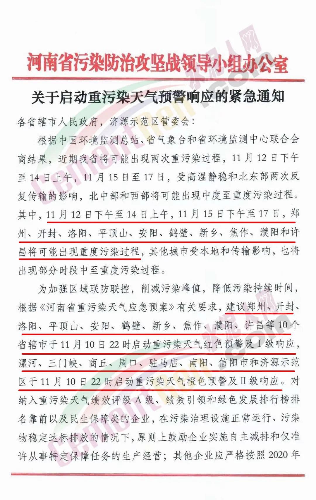 鄭州、開封、 洛陽、平頂山、安陽、鶴壁、新鄉(xiāng)、焦作、濮陽、許昌等10個省轄市于11月10日22時啟動重污染天氣紅色預警及I級響應。漯河、三門峽、商丘、周口、駐馬店、南陽、信陽市和濟源示范區(qū)于11月10日22時啟動重污染天氣橙色預警及II級響應。對納入重污染天氣績效評級A級、績效引領和綠色發(fā)展排行榜排 名靠前以及民生保障類的企業(yè),在污染治理設施正常運行、污染物穩(wěn)定達標排放的情況下,原則上鼓勵企業(yè)實施自主減排和僅準許從事特定保障任務的生產經營;其他企業(yè)應嚴格按照2020年重污染天氣應急減排清單實施相應級別管控措施。應急搶險、重大民生工程和重點項目,在嚴格落實“六個百分之百”施工要求 的前提下,可正常施工。 重污染天氣預警期間,請各地重點加強對城市建成區(qū)及周邊排污企業(yè)的管控力度,對應停未停、應限不限、預警前故意抬高排放量及用電量,或借“出于安全考慮無法停下來” “設備調試、 檢修”名義規(guī)避管控的企業(yè)依法依規(guī)嚴格處理。各地要主動對社會發(fā)聲,提醒公眾做好健康防護措施,倡導公眾低碳生活、綠色消費,單位和公眾盡量減少含揮發(fā)性有機物的涂料、油漆、溶劑 等原材料和產品的使用,自覺接受社會監(jiān)督,同心協(xié)力做好重污 染天氣應急應對工作。通知原文如下: