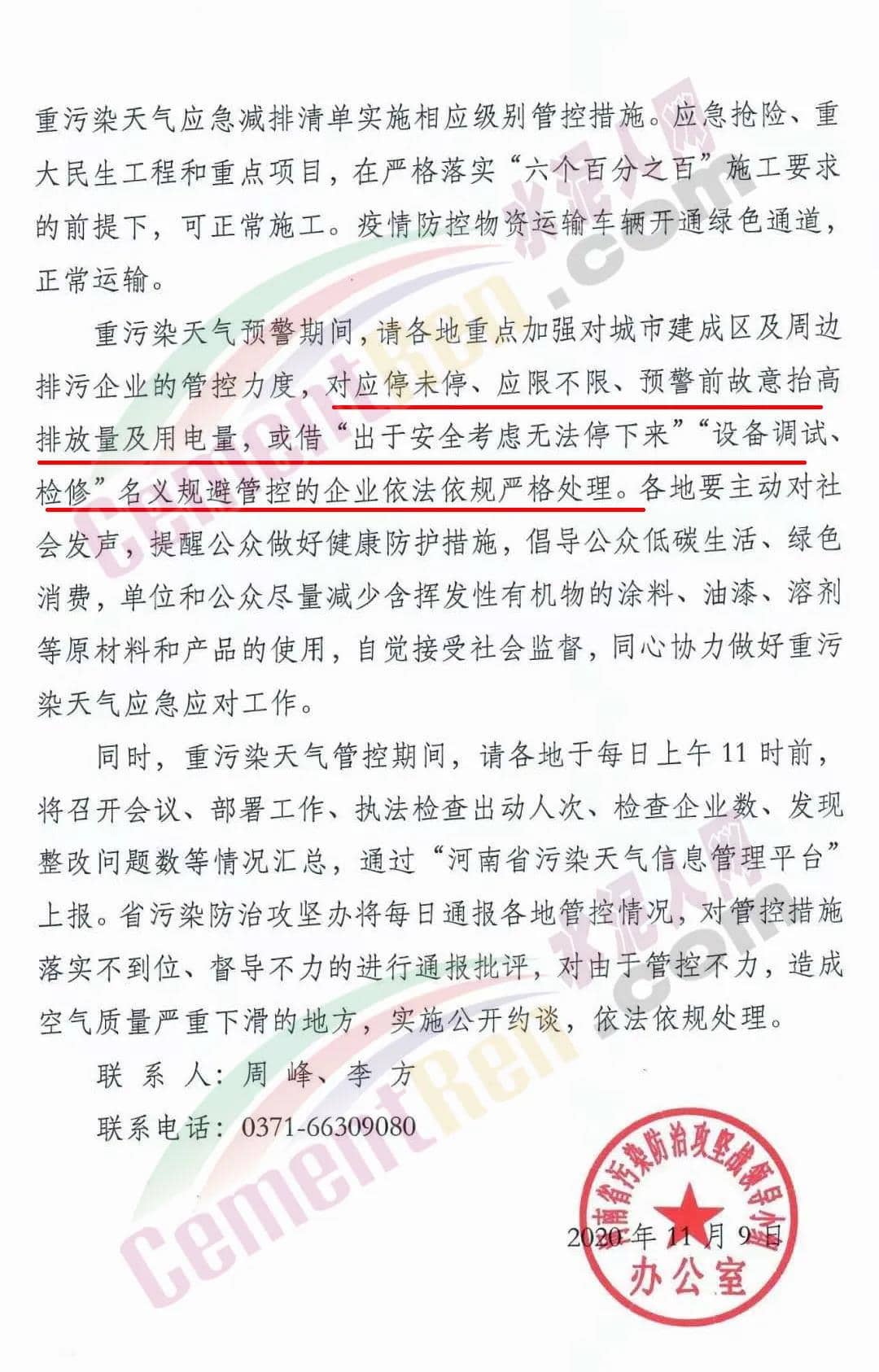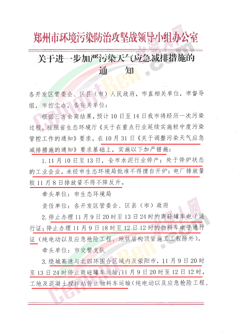 同日,鄭州市環(huán)境污染防治攻堅戰(zhàn)領導小組辦公室發(fā)布《關于進一步加嚴污染天氣應急減排措施的通知》稱, 按照省生態(tài)環(huán)境廳《關于在重點行業(yè)延續(xù)實施輕中度污染管控工作的通知》要求,在10月31日《關于調整污染天氣應急減排措施的通知》要求基礎上,實施加嚴措施: