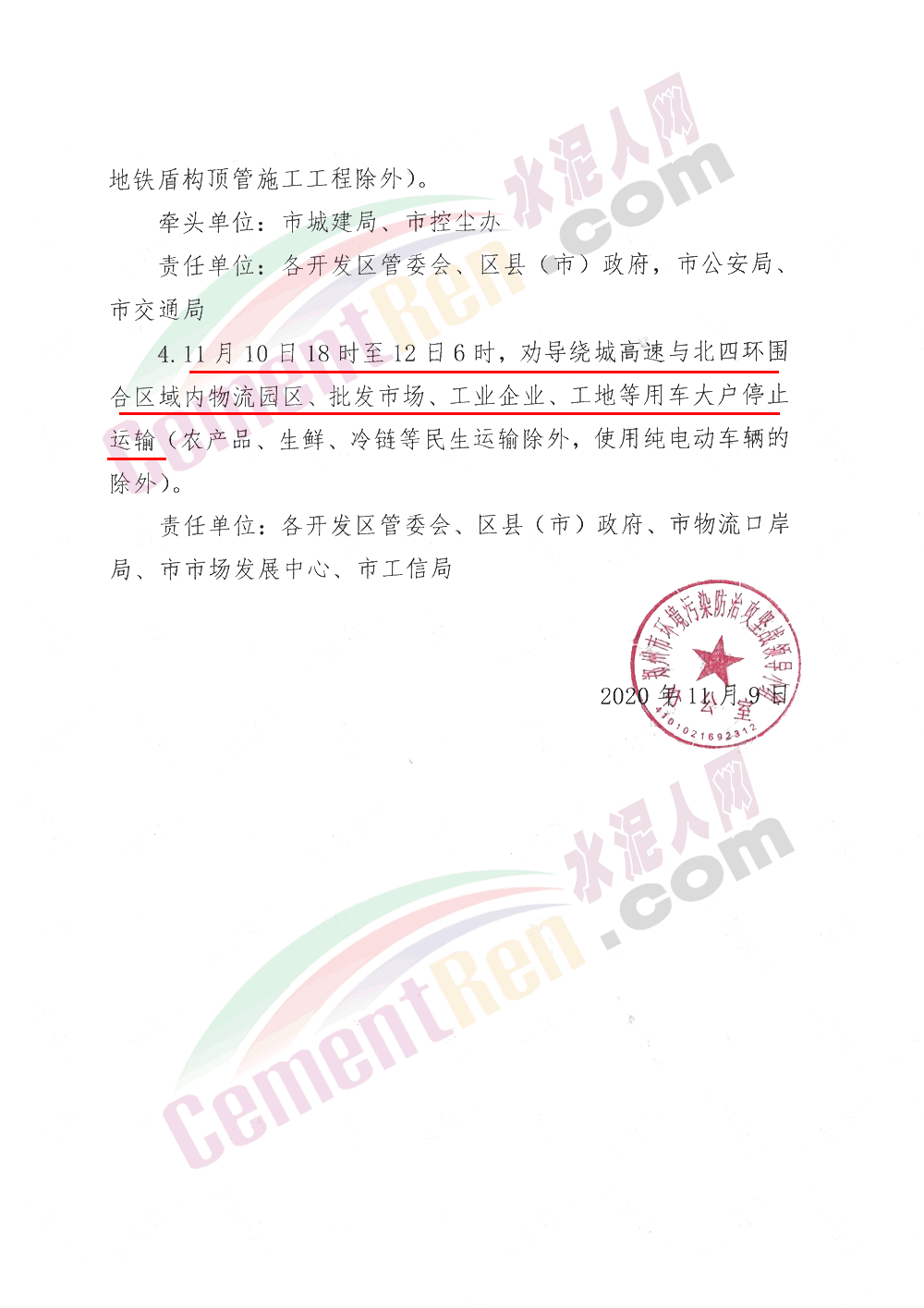 . 11月10日18時至12日6時,勸導繞城高速與北四環(huán)圍合區(qū)域內物流園區(qū)、批發(fā)市場、工業(yè)企業(yè)、工地等用車大戶停止運輸。